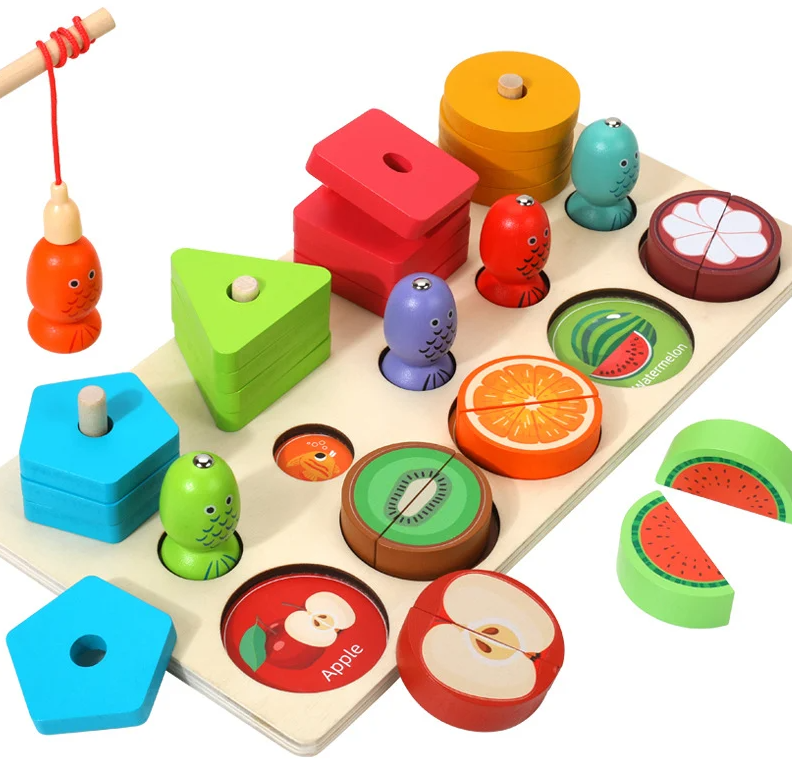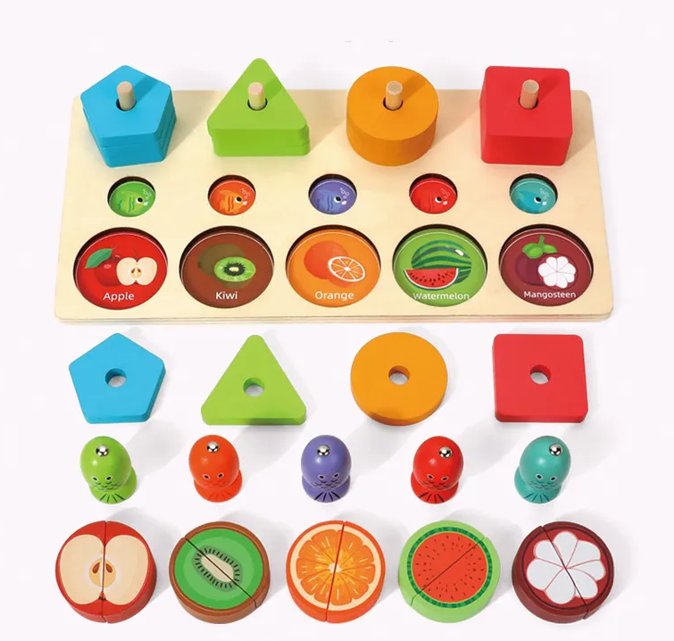 Acest joc de tip Montessori 3 în 1 este destinat copiilor cu vârsta de 3 ani și peste și este conceput pentru a stimula dezvoltarea cognitivă și abilitățile motorii fine ale copiilor. Jocul combină trei activități educative într-un singur set, oferindu-le copiilor oportunitatea de a învăța despre forme geometrice, fructe și culori printr-o experiență interactivă și distractivă.