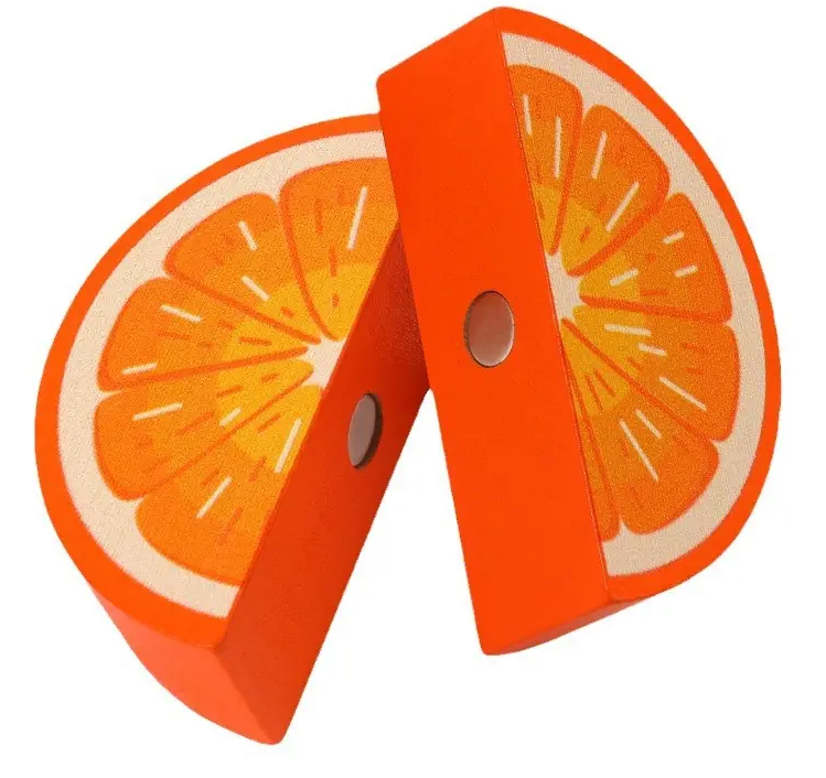- Conține cinci tipuri de fructe din lemn, fiecare tăiat în jumătate și echipat cu magneți pentru a facilita potrivirea părților.