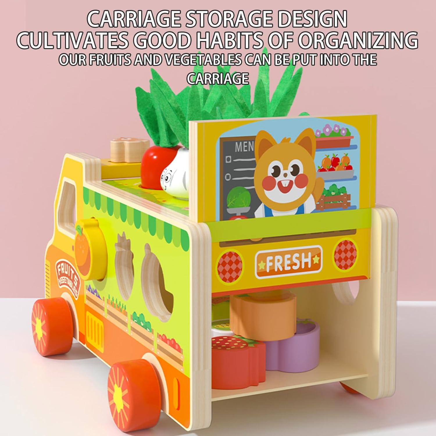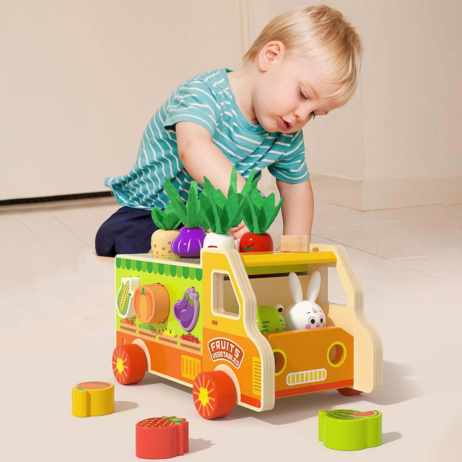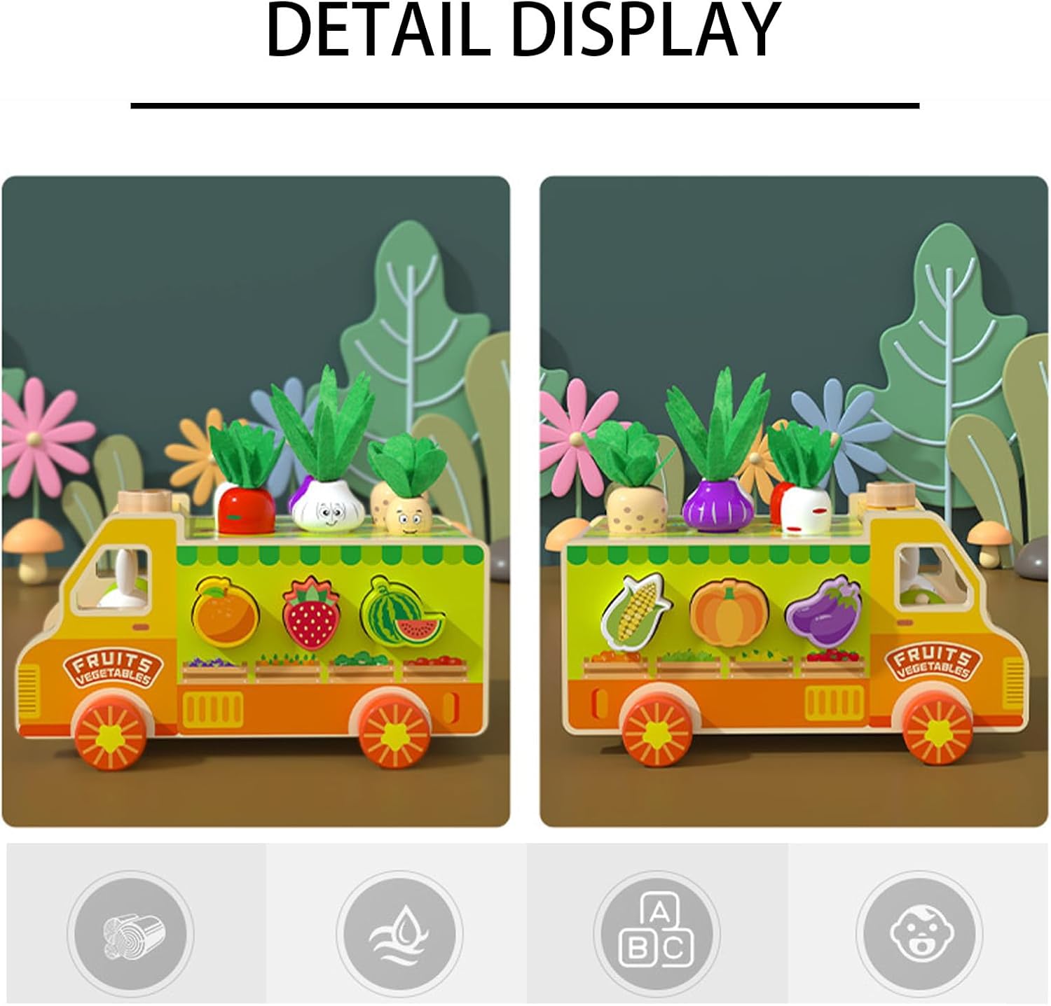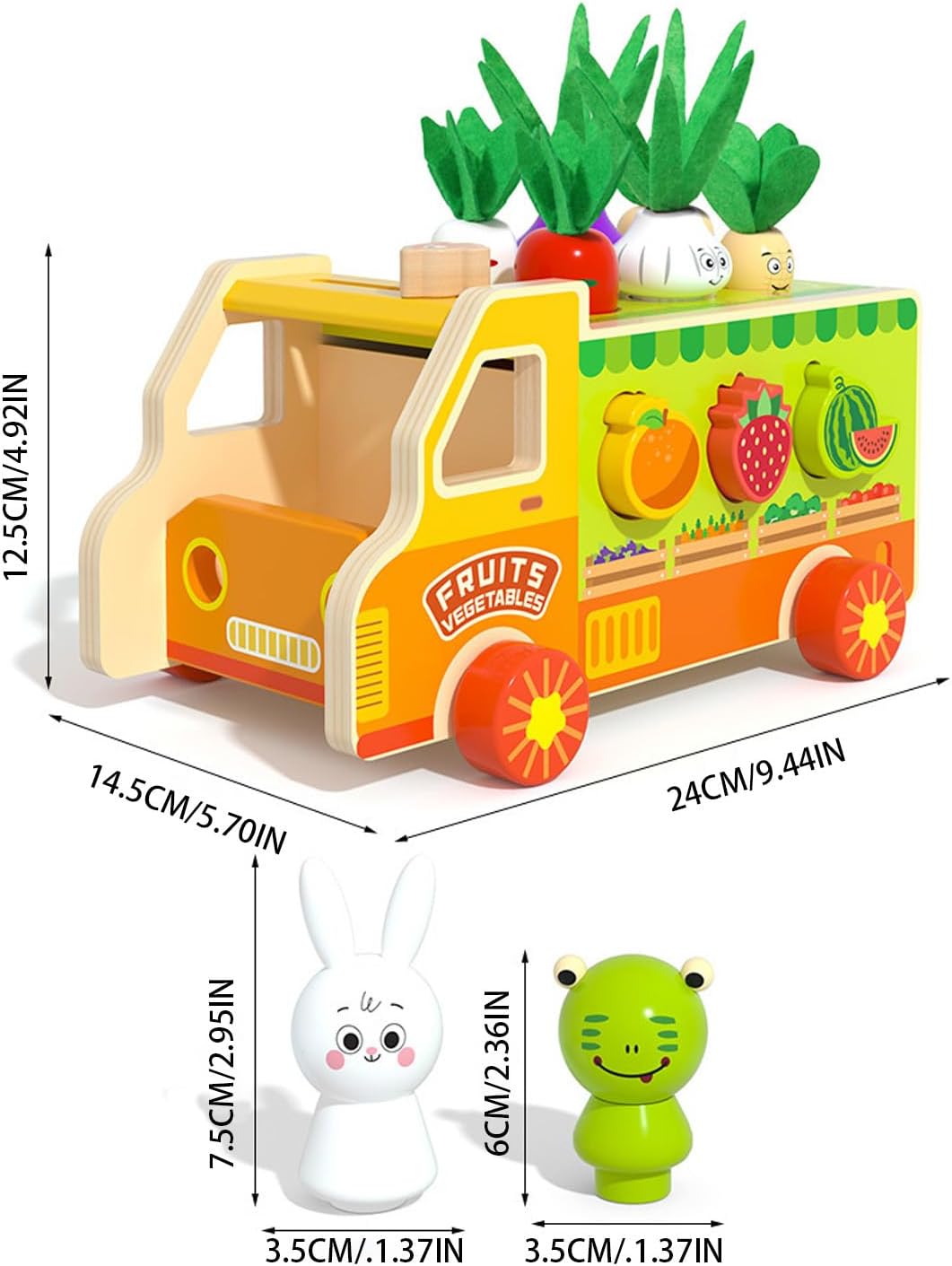 Camionul din lemn este echipat cu diverse legume și fructe care pot fi scoase și potrivite în spațiile corespunzătoare. Fiecare piesă este realizată cu atenție la detalii, având forme și culori distincte, ce ajută copiii să învețe despre forme și culori într-un mod distractiv și interactiv.