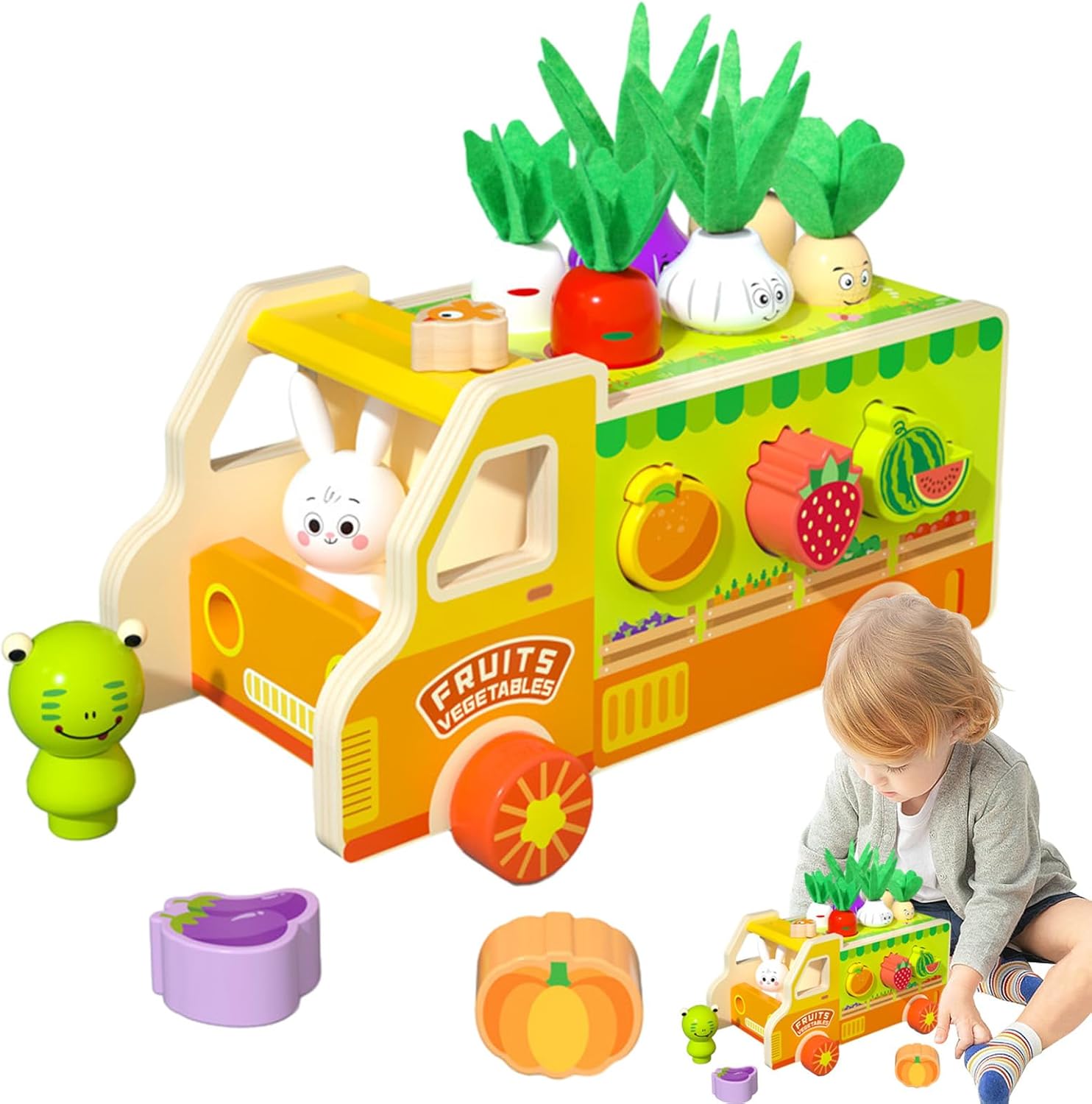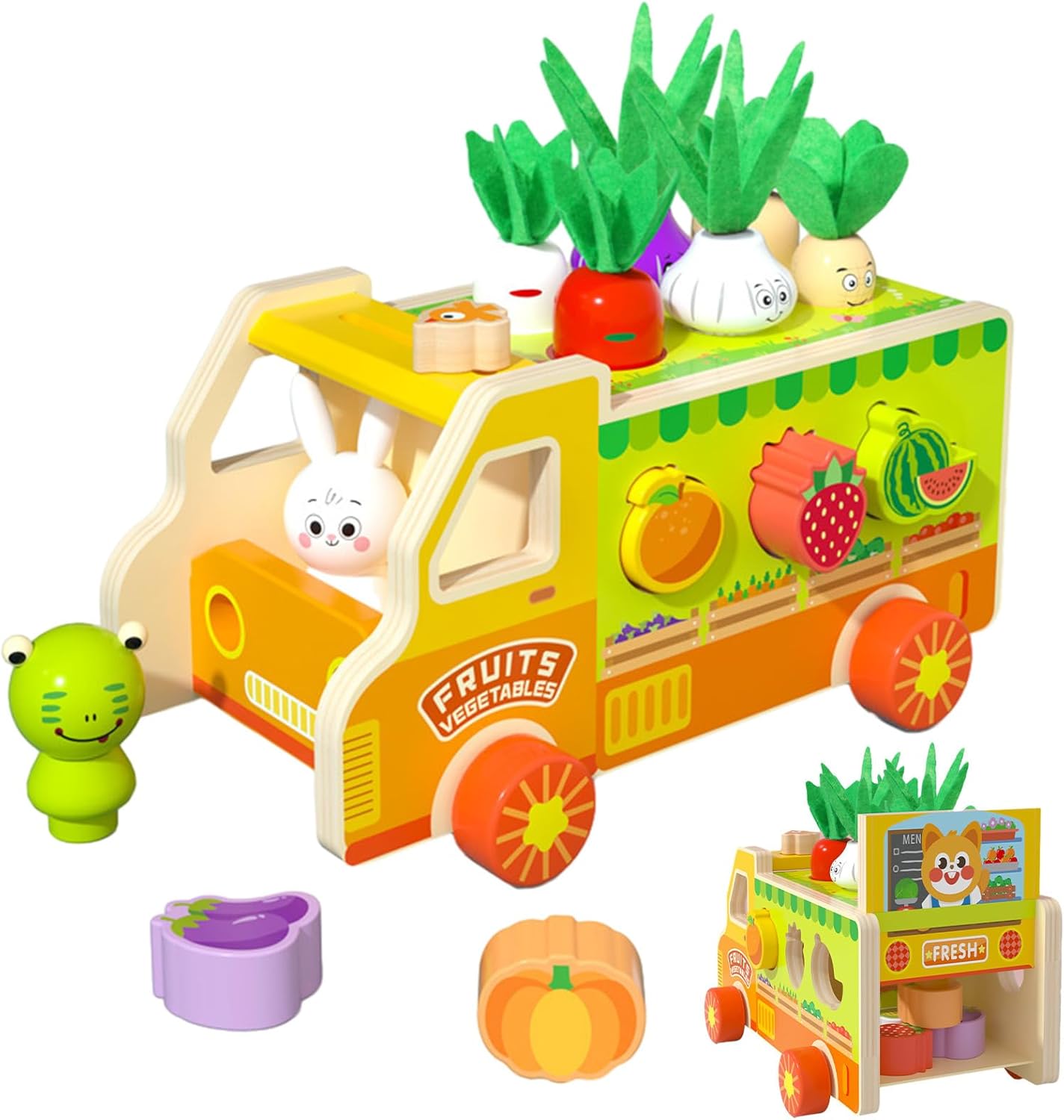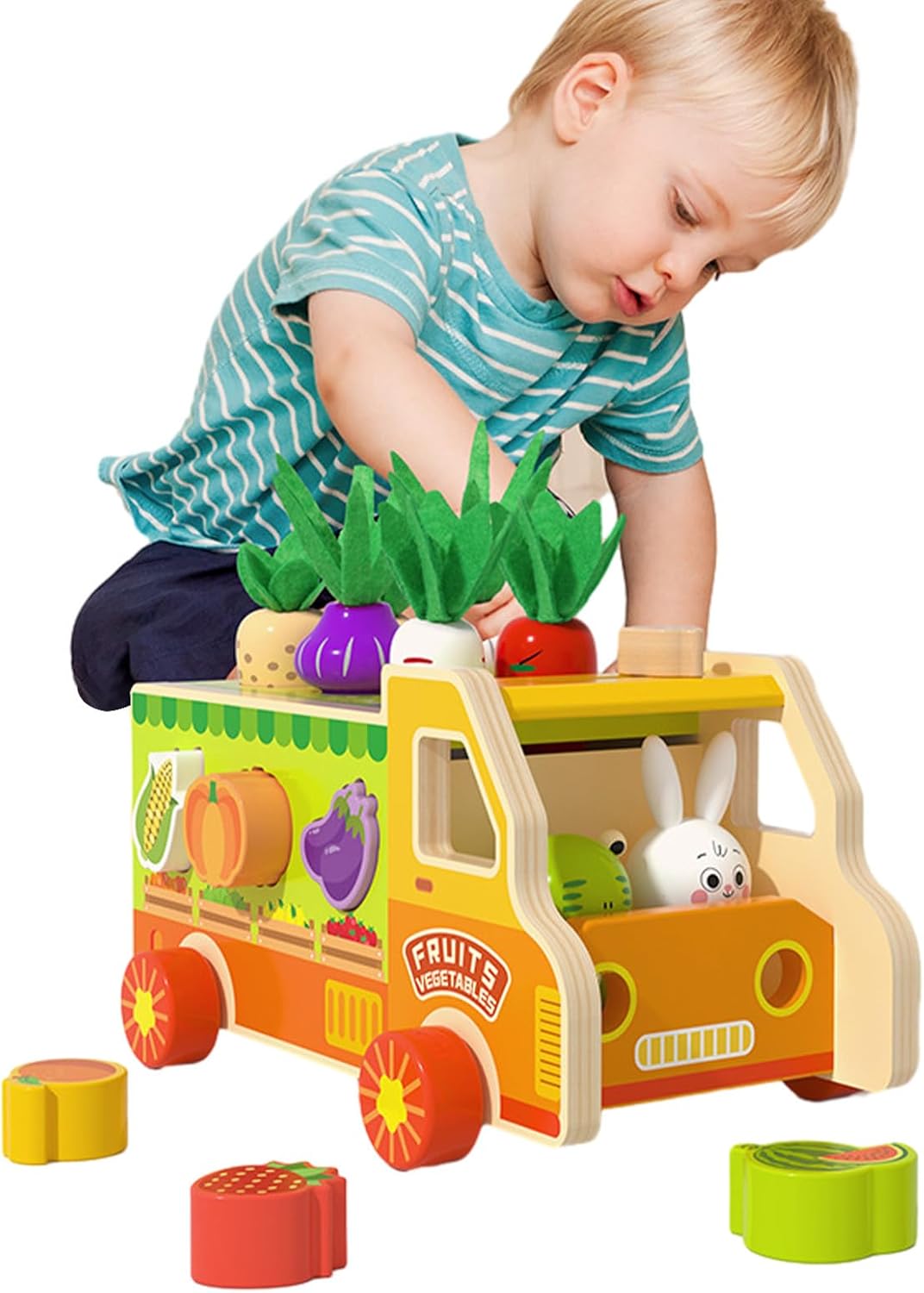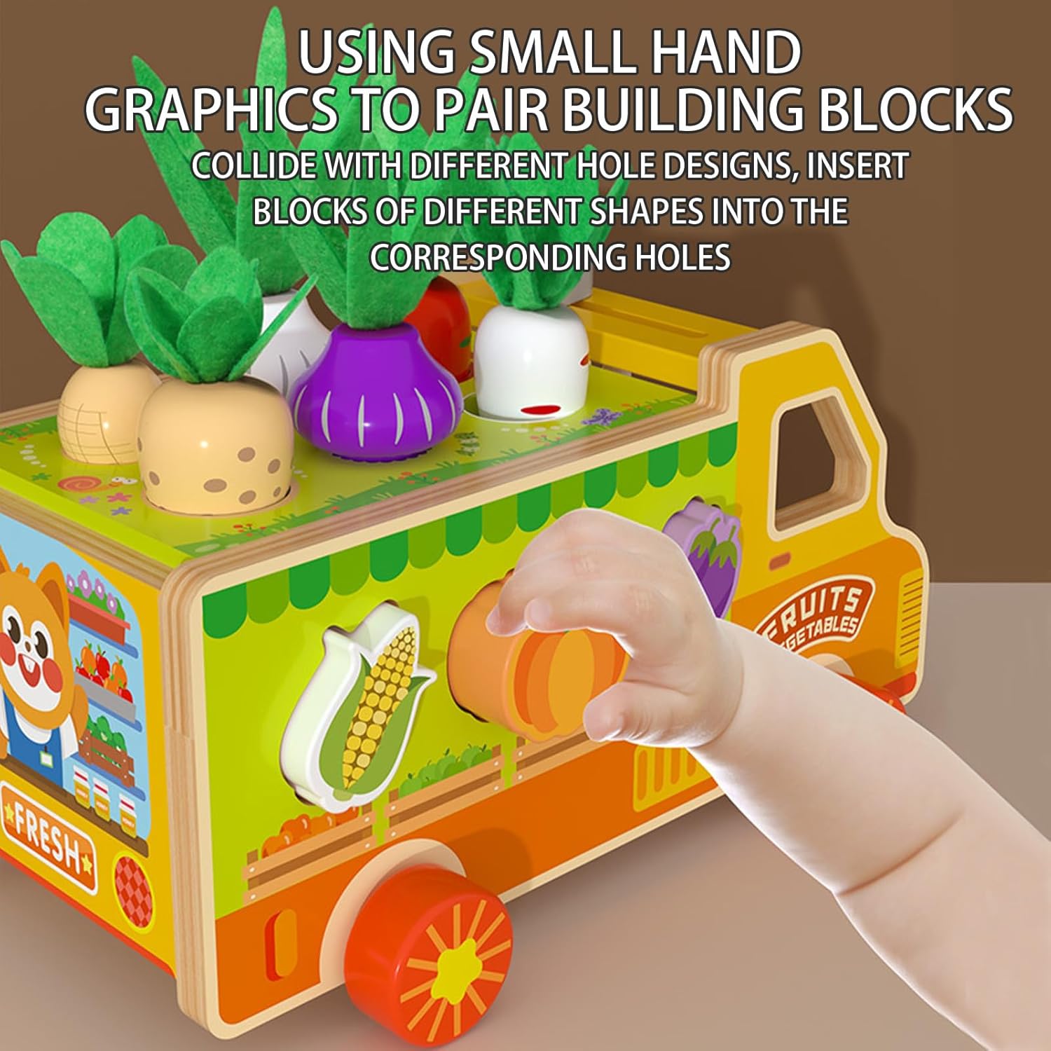 Camionul din lemn este echipat cu diverse legume și fructe care pot fi scoase și potrivite în spațiile corespunzătoare. Fiecare piesă este realizată cu atenție la detalii, având forme și culori distincte, ce ajută copiii să învețe despre forme și culori într-un mod distractiv și interactiv.