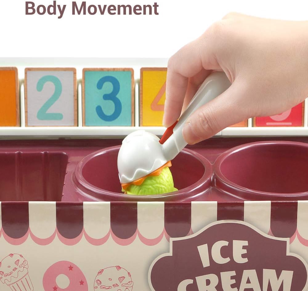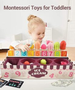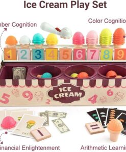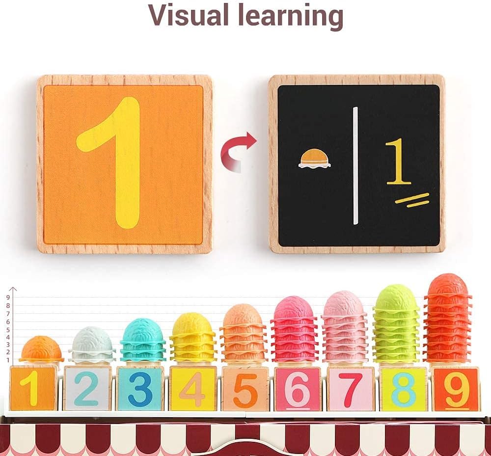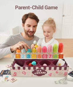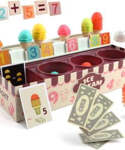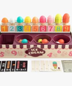 Acest joc educativ de tip Montessori transformă învățarea într-o experiență distractivă prin joaca de rol cu înghețată. Copiii pot învăța cifrele, culorile, concepte de matematică de bază (adunare și scădere) și chiar noțiuni financiare prin intermediul acestui set interactiv.