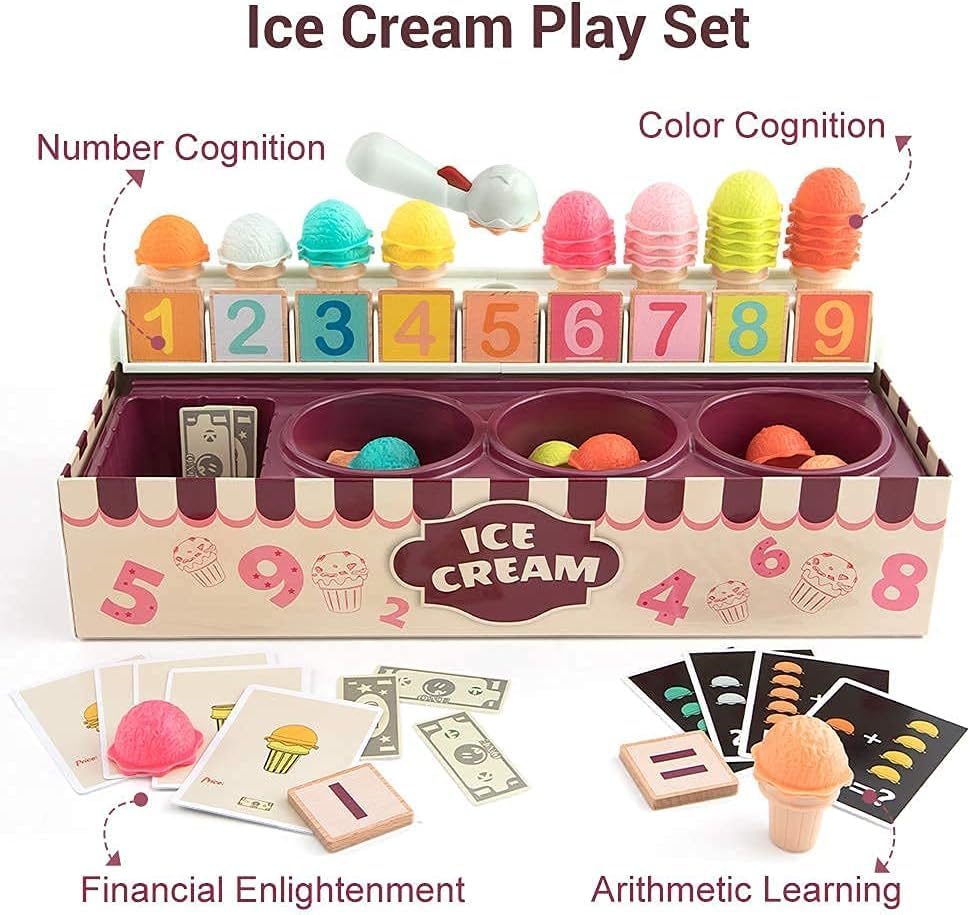 Setul include cornete și bile de înghețată colorate, plăcuțe numerice, carduri cu operații matematice, carduri cu „comenzi” și bancnote de jucărie pentru simularea cumpărăturilor.