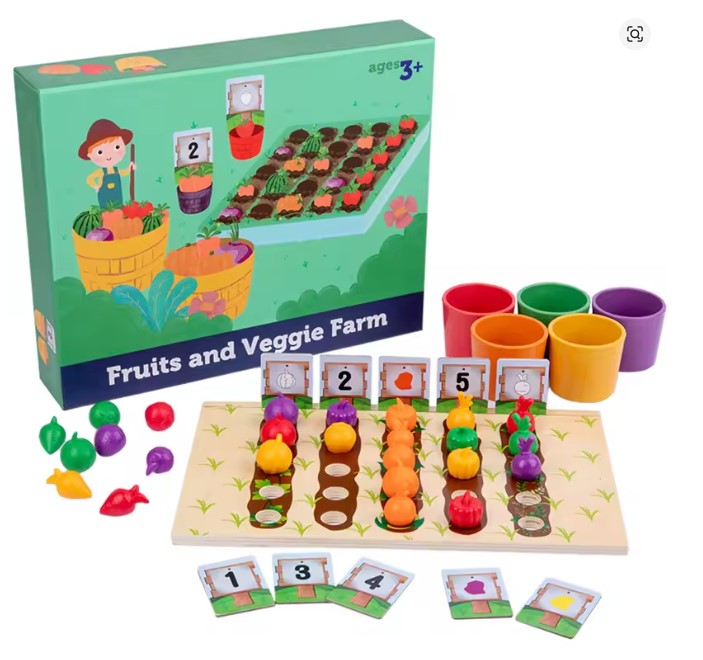 Joc educativ tip Montessori – Grădina mea de fructe și legume, 3 ani+