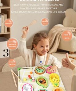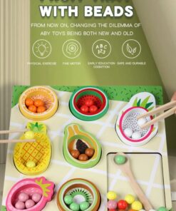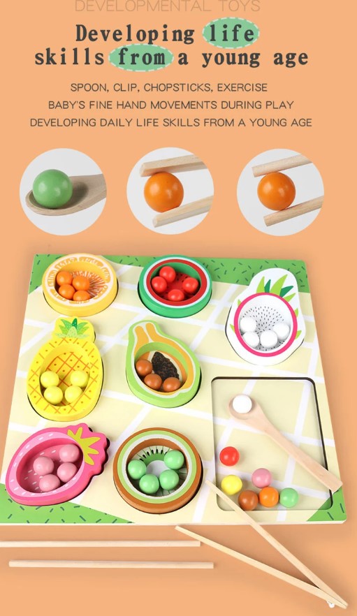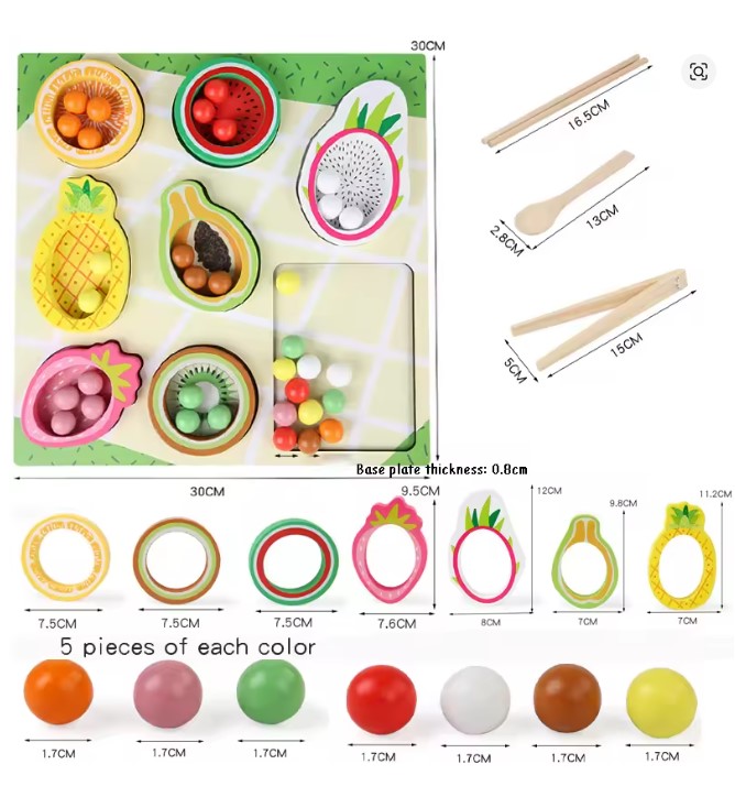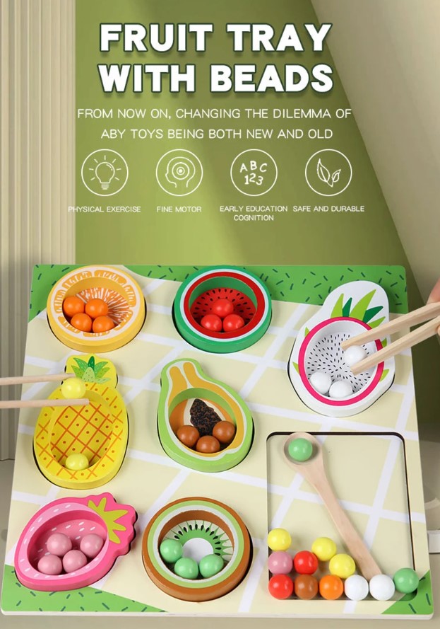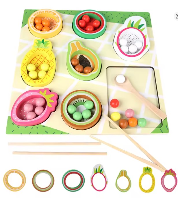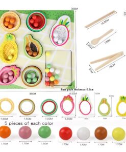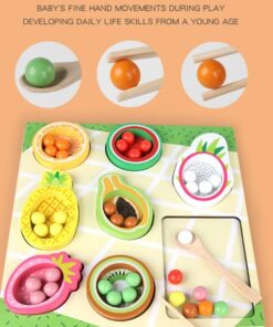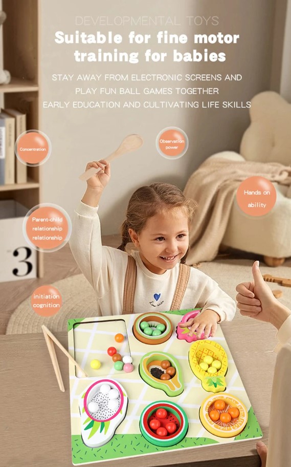 ✔ Coordonare mână–ochi: copilul învață să potrivească bilele colorate în fructele corespunzătoare.
