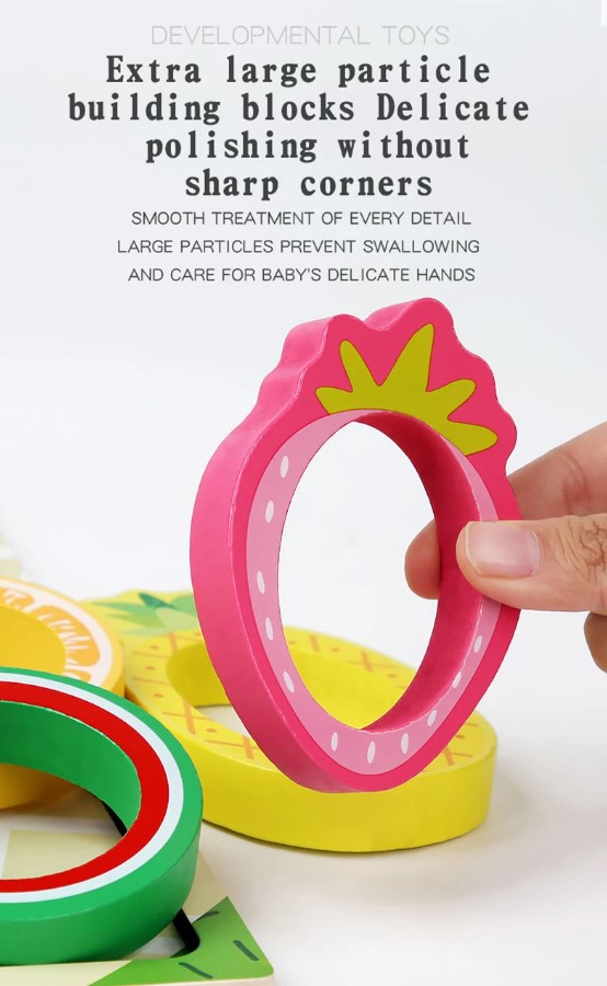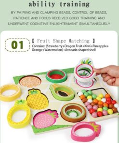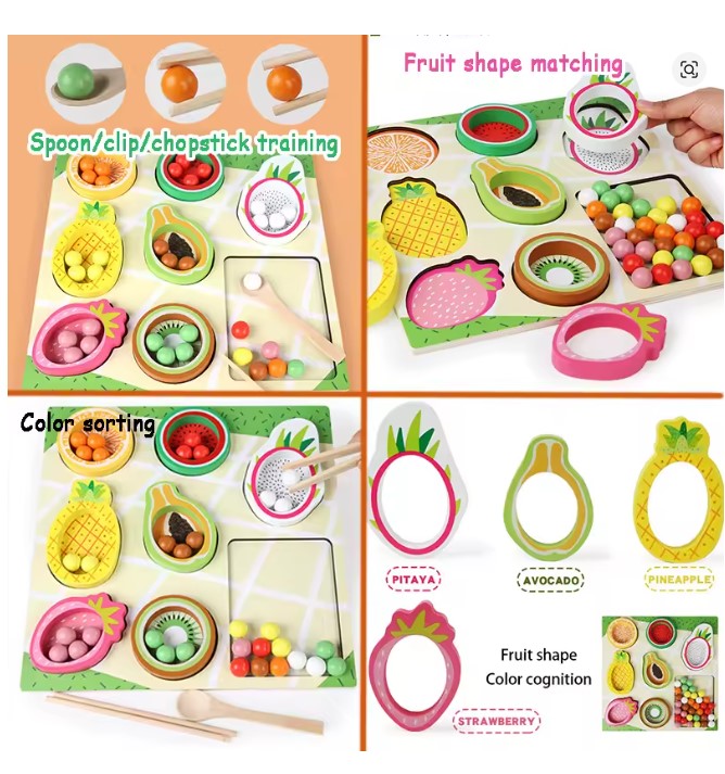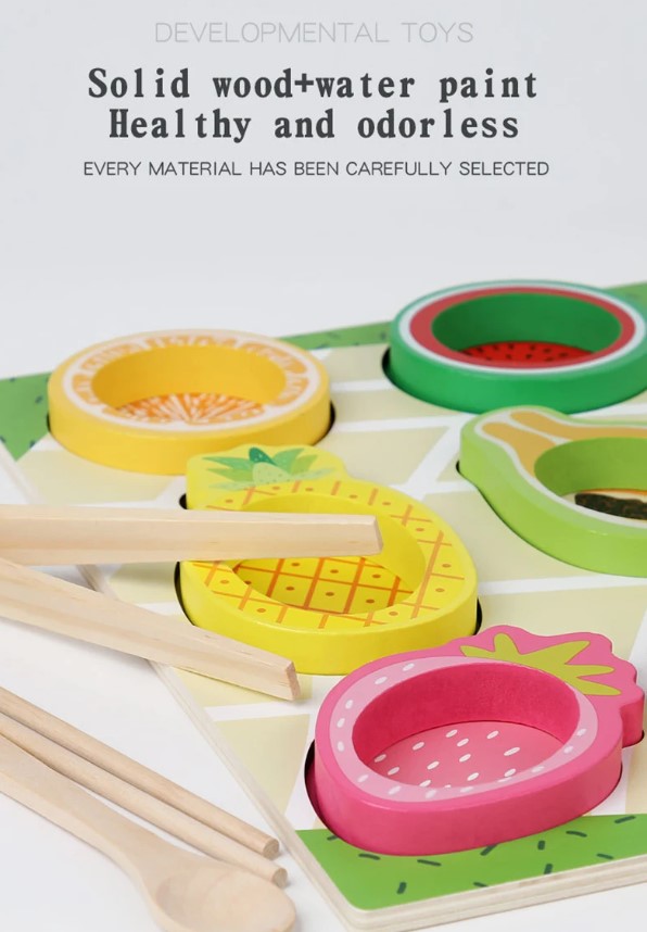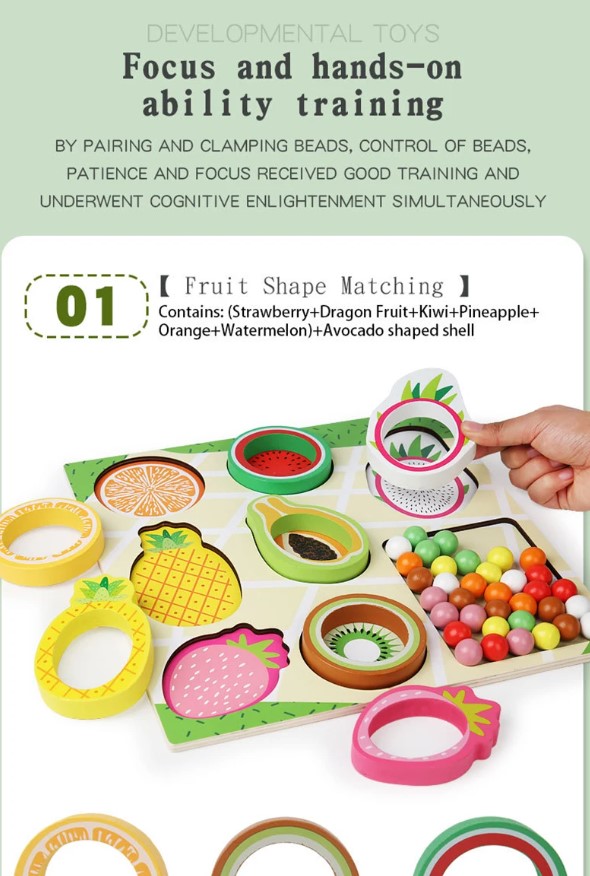 Un joc educativ de tip Montessori, conceput pentru a dezvolta motricitatea fină, coordonarea, atenția și capacitatea de asociere a copiilor. Cu piese mari, colorate și sigure, în formă de fructe exotice, jocul este ideal atât pentru activități acasă, cât și pentru terapie logopedică, ABA sau lucrul cu copii cu nevoi speciale.