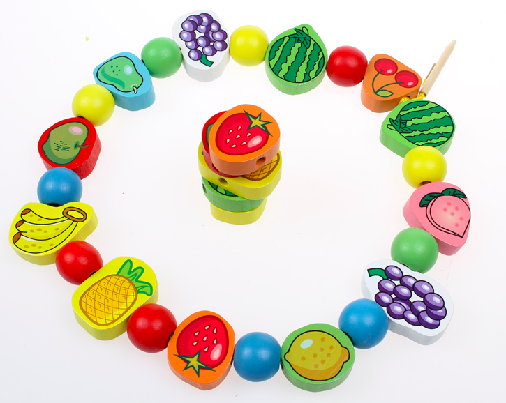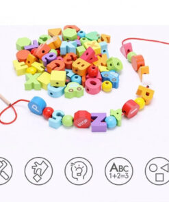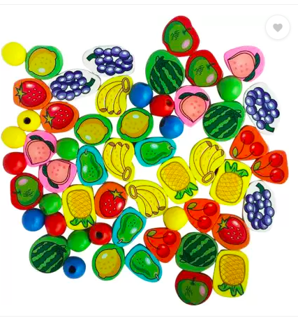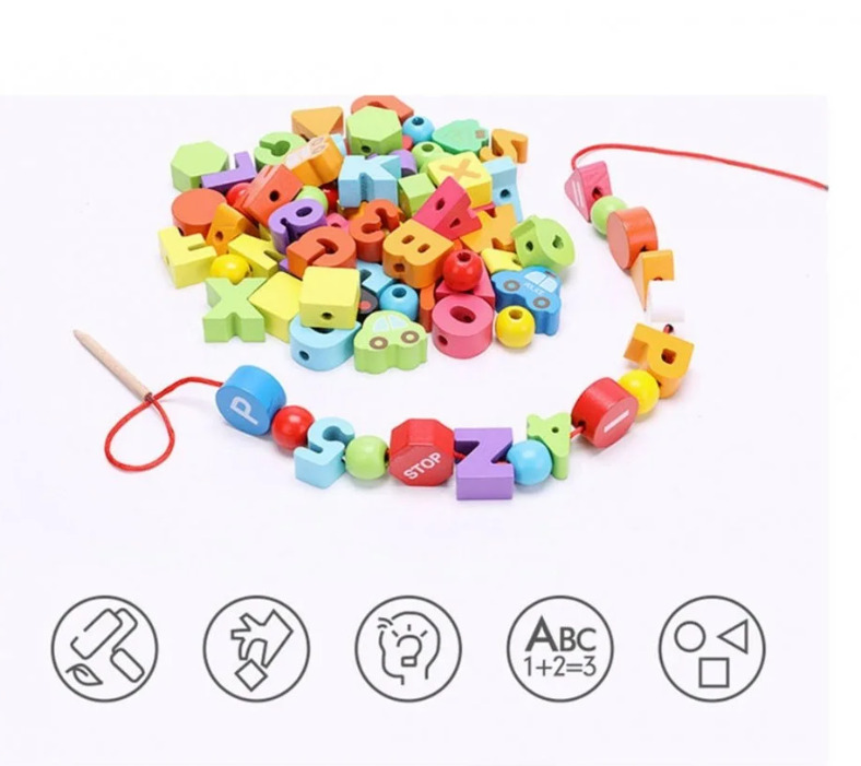 Joc de tip Montessori, set 56 margele din lemn, 3 ani