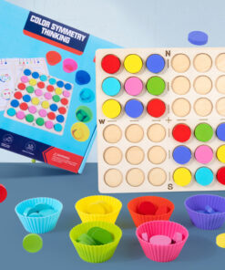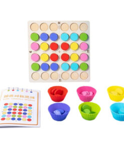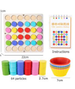 Include o carticica cu diferite combinatii de culori, de pe care copii trebuie sa urmareasca tiparul si sa introduca jetoanele pe placa suport in asa fel incat dispunerea realizata sa corespunda cu modelul de pe brosura.