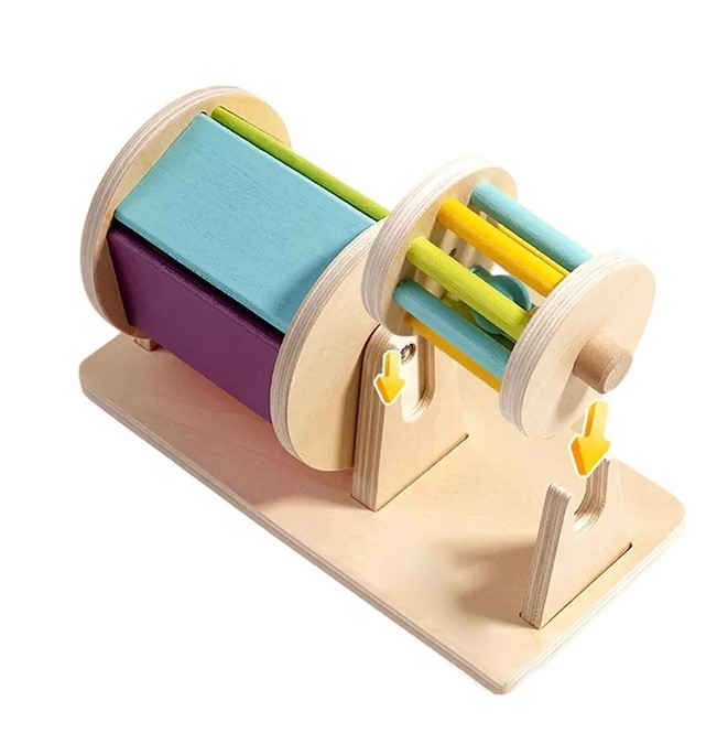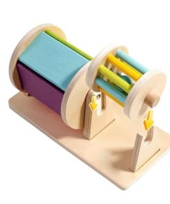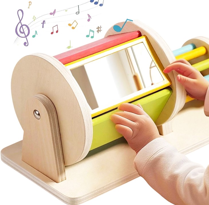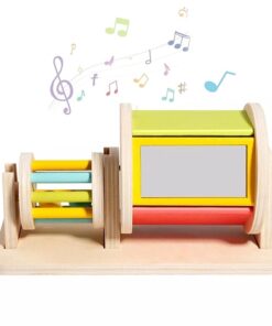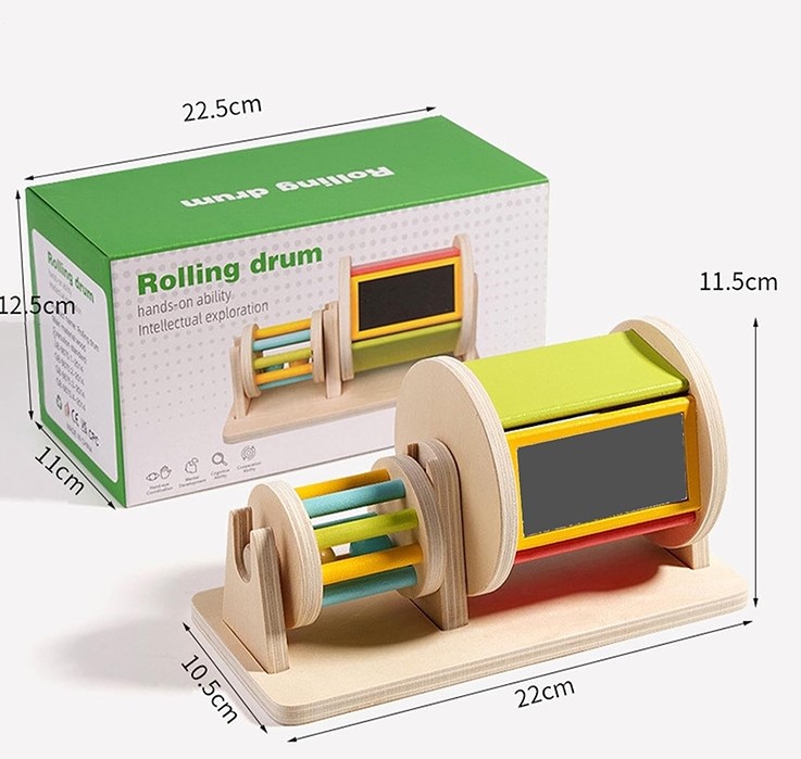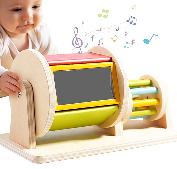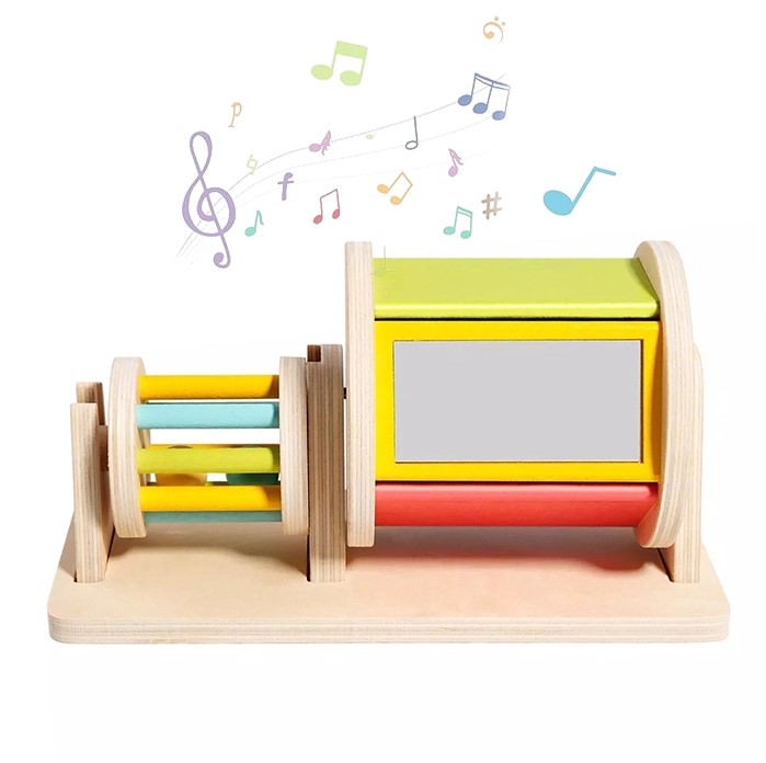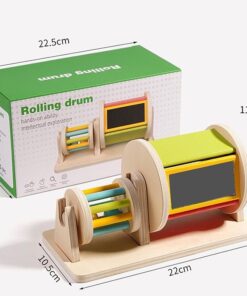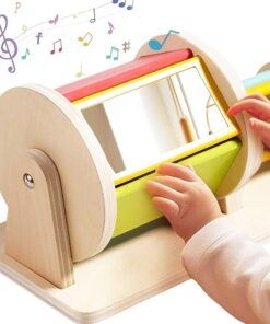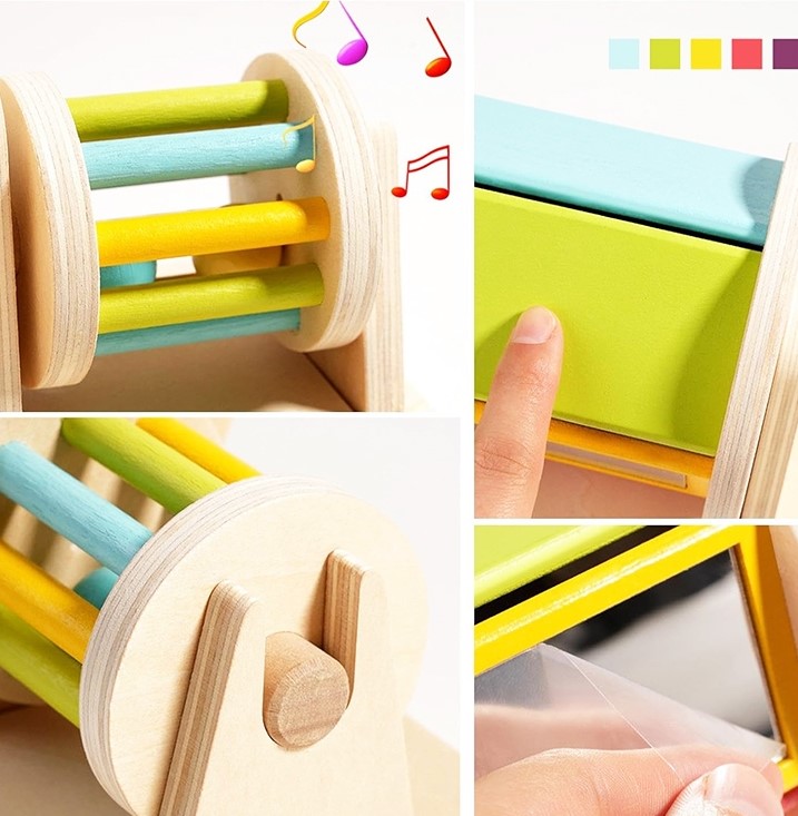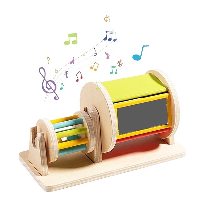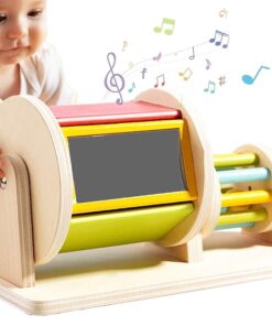 Realizat din lemn de înaltă calitate, tamburul este prevăzut cu o secțiune rotativă cu bile colorate și un cilindru care emite sunete blânde în momentul în care este rotit, oferind copilului o experiență multisenzorială captivantă.