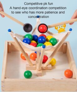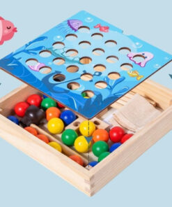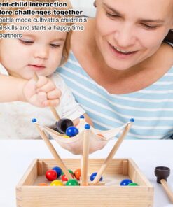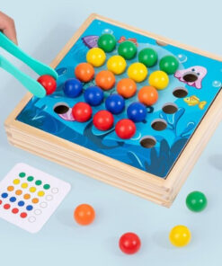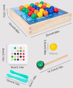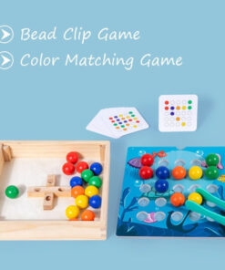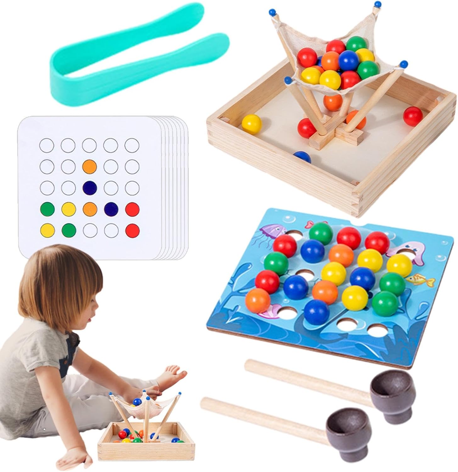 Setul conține bile colorate din lemn, o tavă de joc, pensetă, lingurițe din lemn și carduri cu modele, oferind copiilor două moduri de joc într-un singur produs.