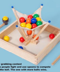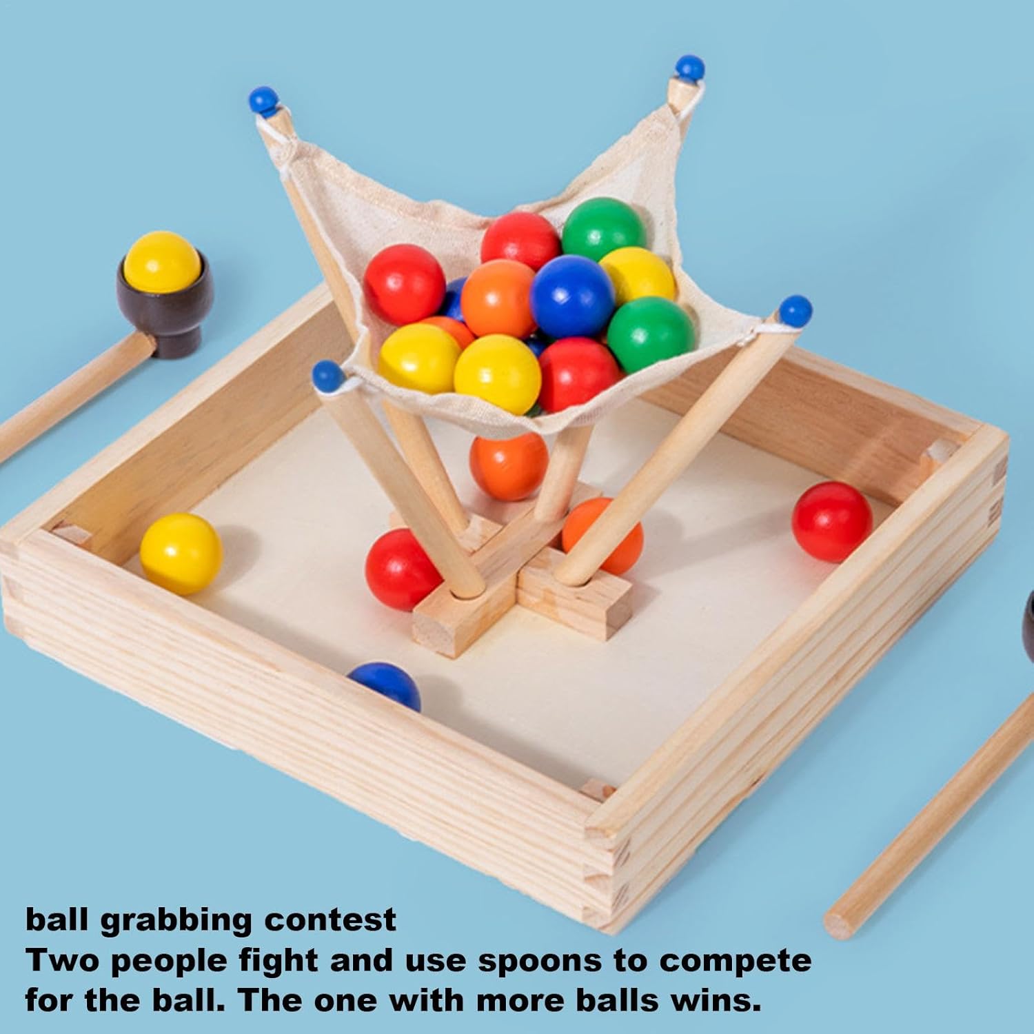 Bilele sunt așezate în „plasa” textilă, iar doi jucători folosesc lingurițele pentru a prinde cât mai multe bile.