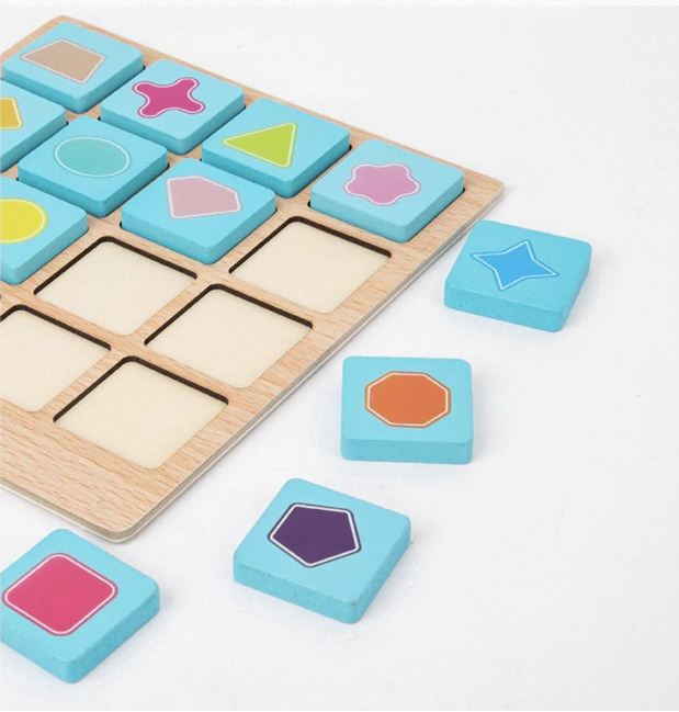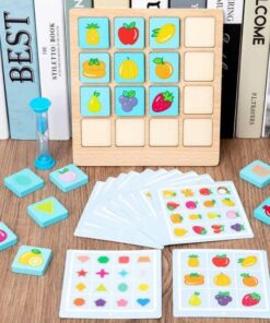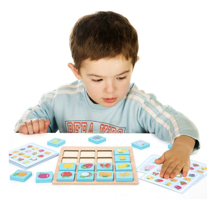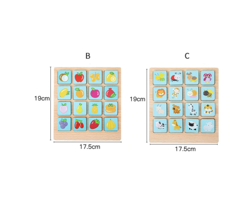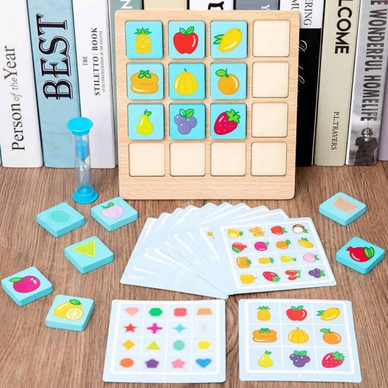 Cu ajutorul acestui joc de logica, cei mici vor invata sa recunoasca tiparele potrivite, prin identificarea corecta a perechilor de fructe sau forme geometrice aflate cardul ilustrat drept model. Jocul contine16 de jetoane din lemn. Scopul jocului este sa-i ajute pe cei mici sa-si exerseze memoria, gandirea si motricitatea fina intr-un mod distractiv.