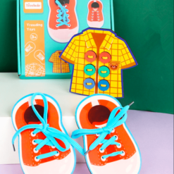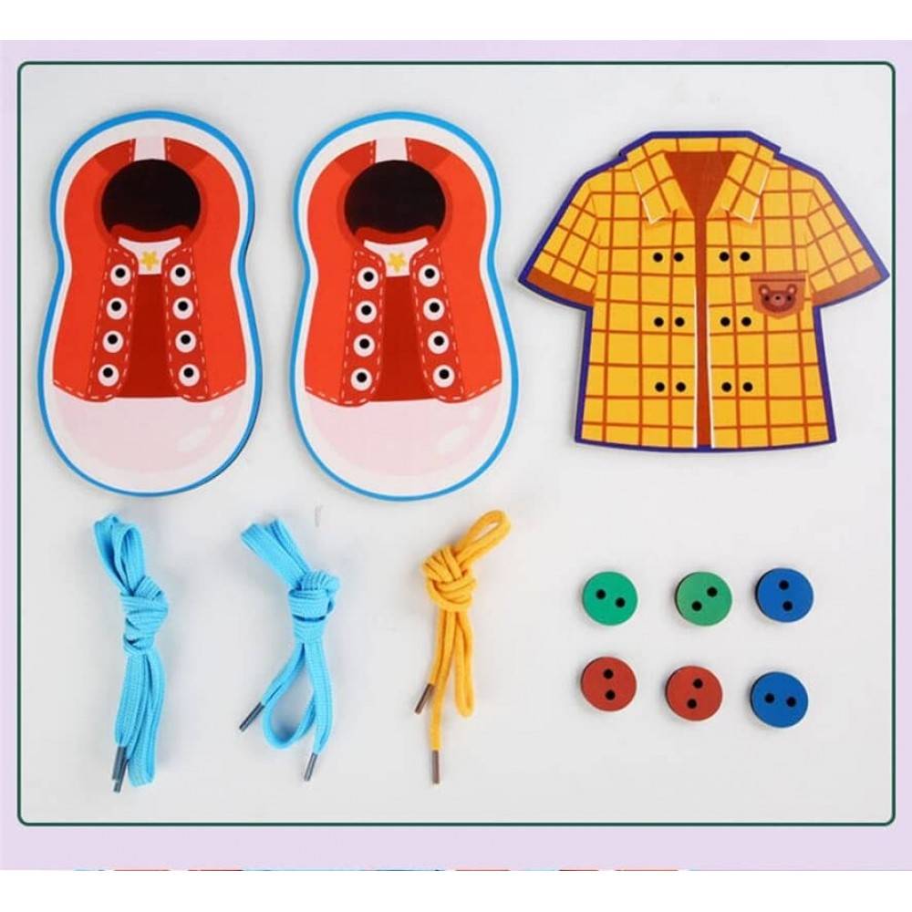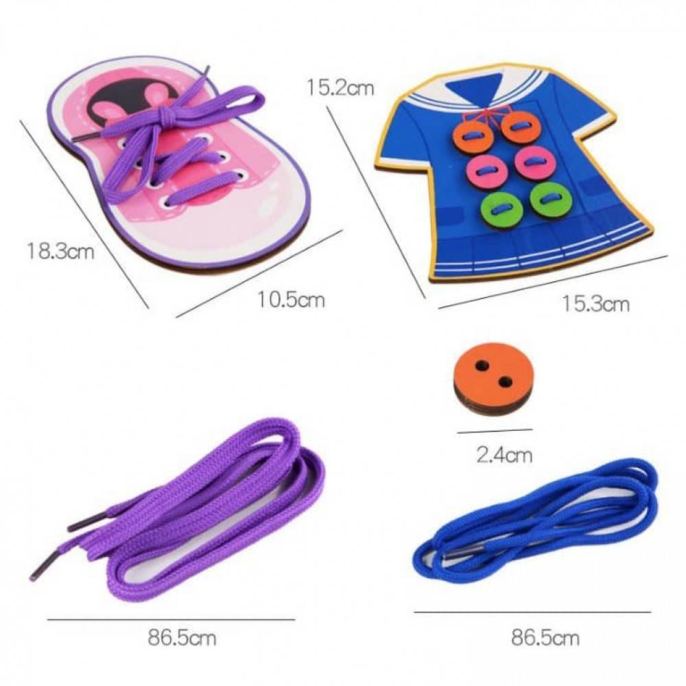 Jocul din lemn de siretuit – Camasa si pantofi are scopul de a-i ajuta pe copii să-și dezvolte abilitati motrice fine, coordonarea mana-ochi, exercitarea flexibilitatii degetelor și rezolvarea problemelor.