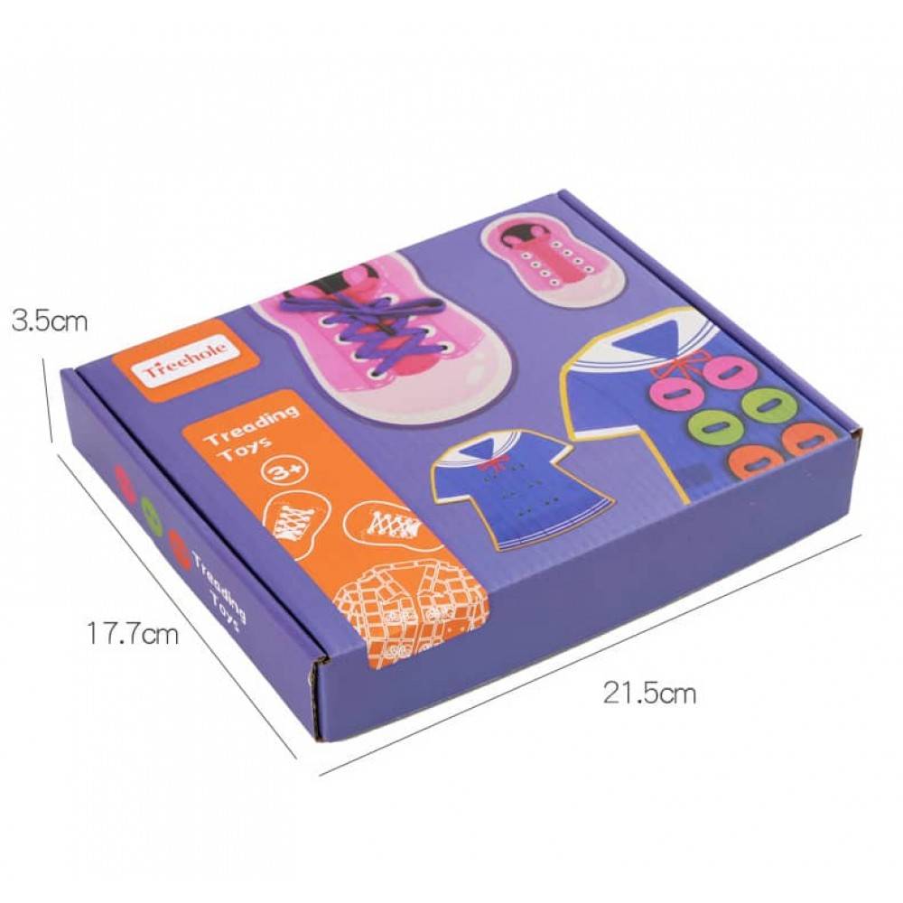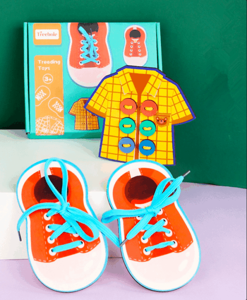Procedura de legare a sireturilor si cea de cusut au nevoie de timp si concentrare pentru a fi deprinse si finalizate, cu snurul intarit in varf si nasturii colorati, contribuind astfel la îmbunatatirea rabdarii si a perseverentei copiilor.
