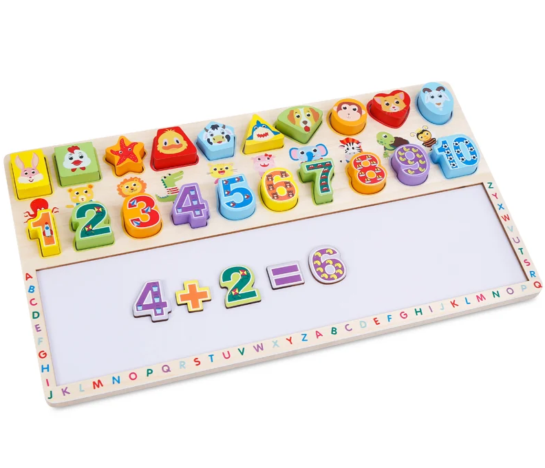 - Cifre și calcule: Folosește cifrele magnetice pentru a învăța numerele, iar cu ajutorul simbolurilor, exersează adunarea și scăderea.