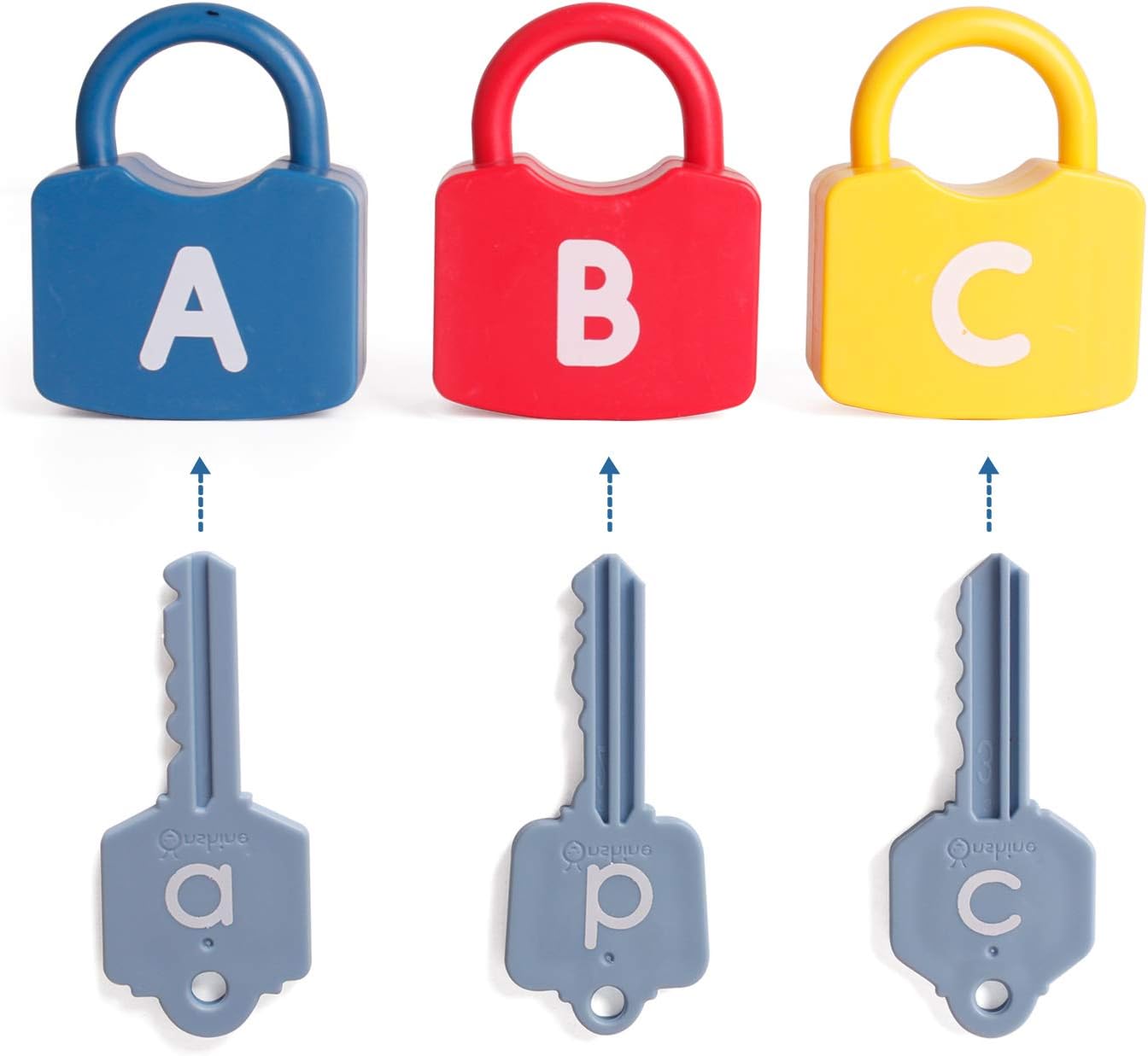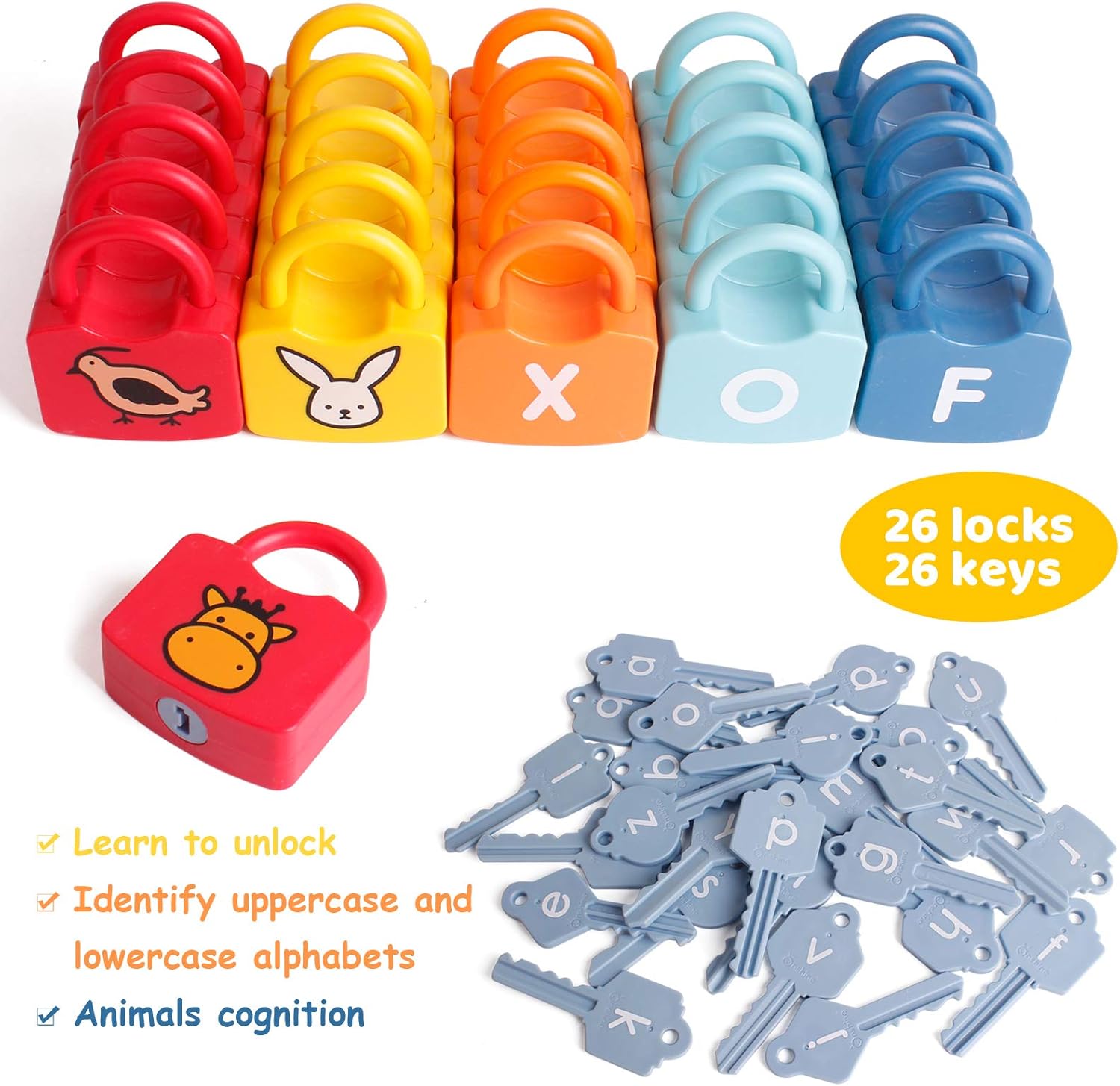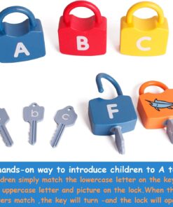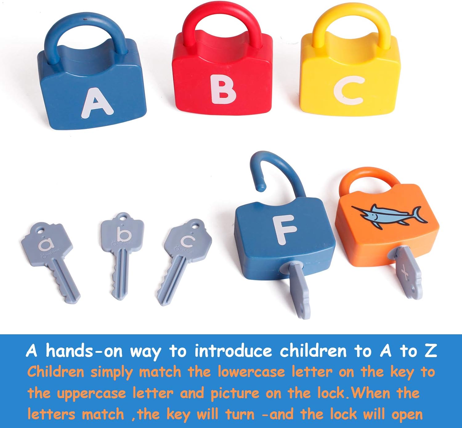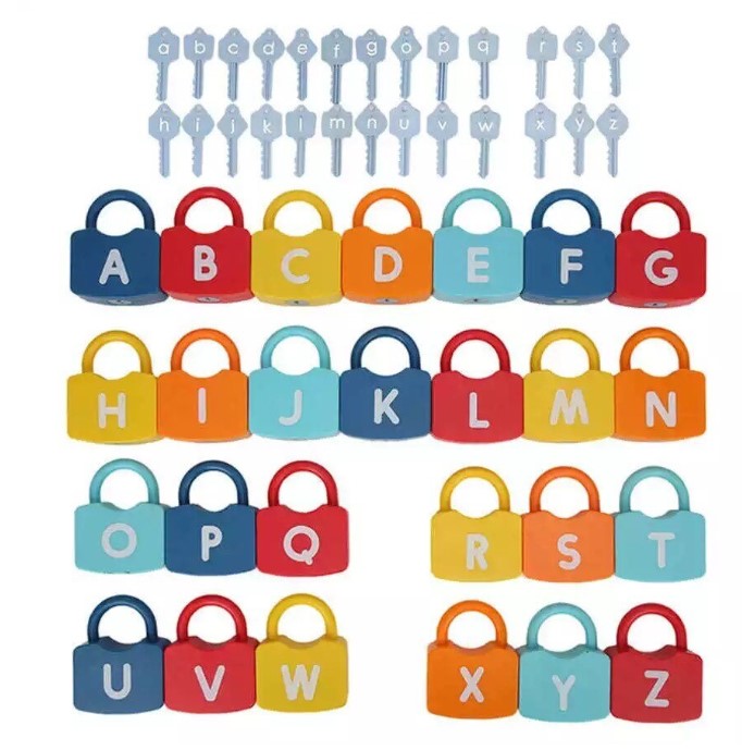 ✔️ Învățarea alfabetului: copiii asociază literele mari (de pe lacăt) cu literele mici (de pe chei)