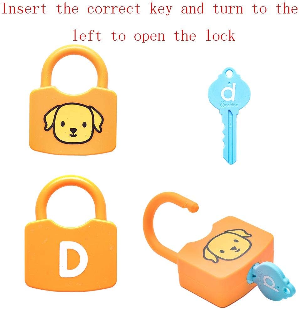 Fiecare lacăt are o literă mare (majuscule) pe spate și o imagine cu un animal asociat literei pe față (ex: „D” – „dog”)