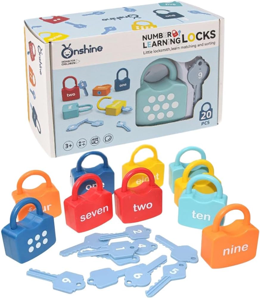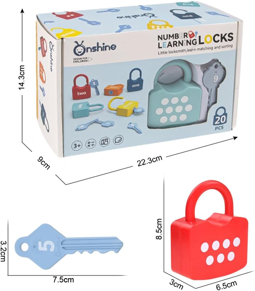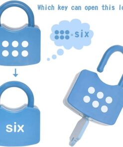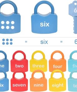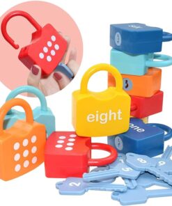 Joc educativ cu lacăte și chei pentru învățarea cifrelor, 20 piese, 3 ani+ este un set interactiv conceput pentru a dezvolta gândirea logică, recunoașterea numerelor și coordonarea mână-ochi. Fiecare lacăt colorat are un număr (scris în cifre, litere și reprezentat prin puncte), iar copilul trebuie să găsească cheia corespunzătoare pentru a-l descuia.