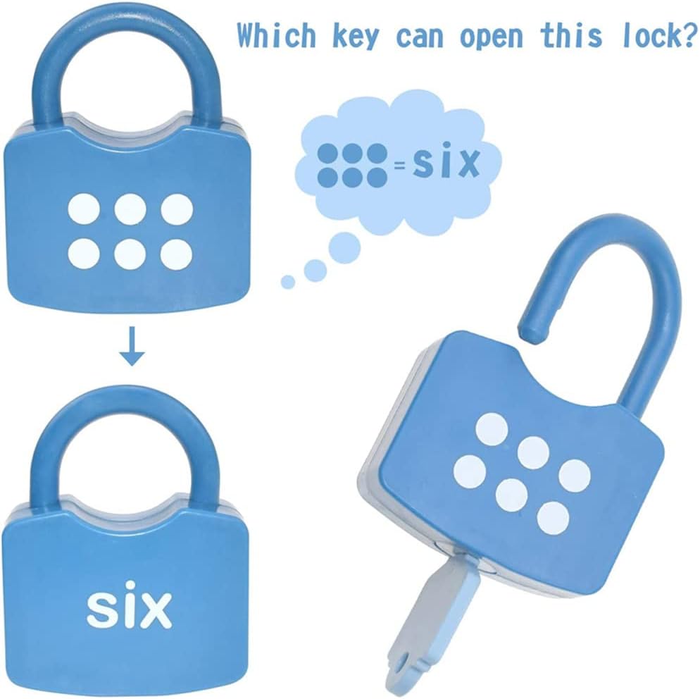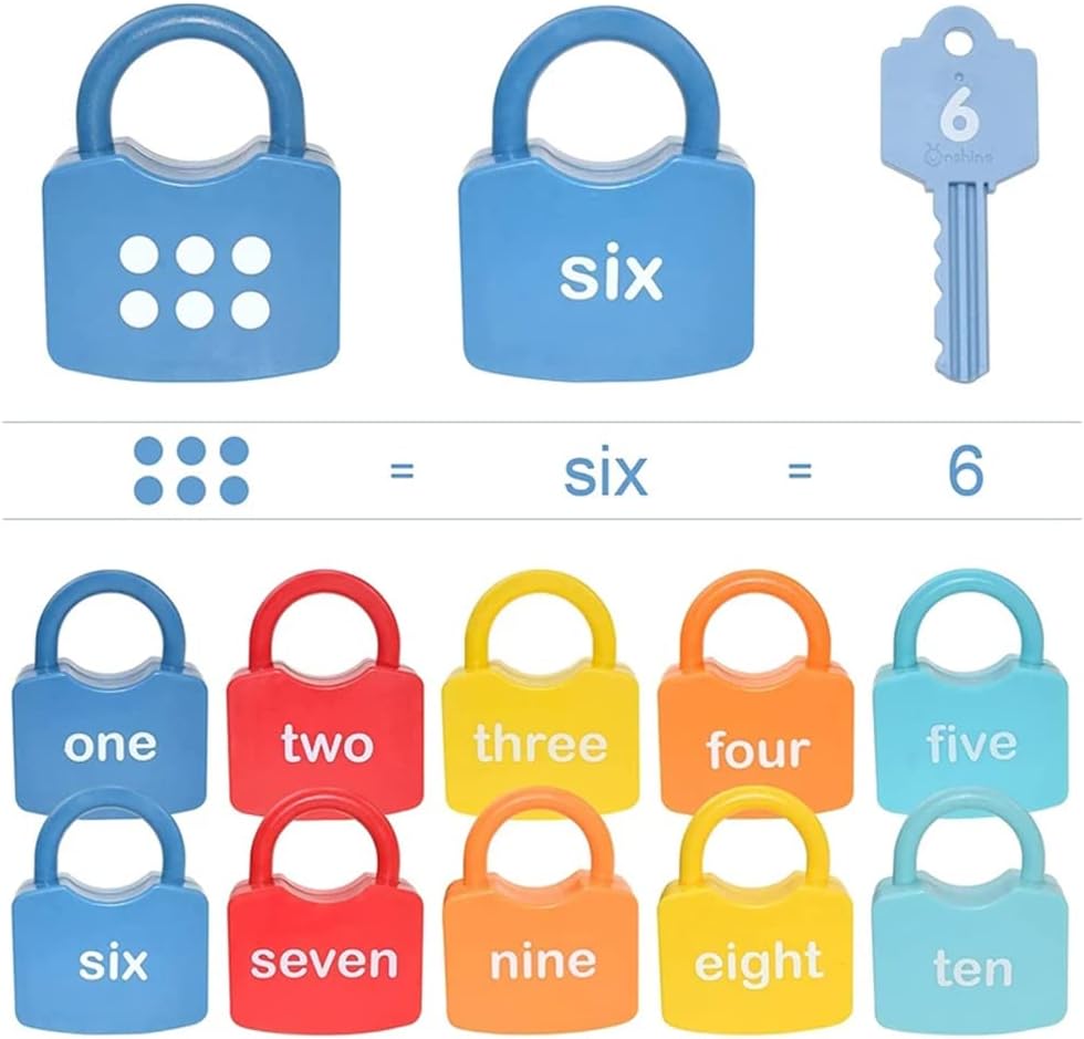 Învățare multisenzorială: Fiecare lacăt ilustrează numărul prin cifră, scriere și puncte, consolidând recunoașterea numerelor.