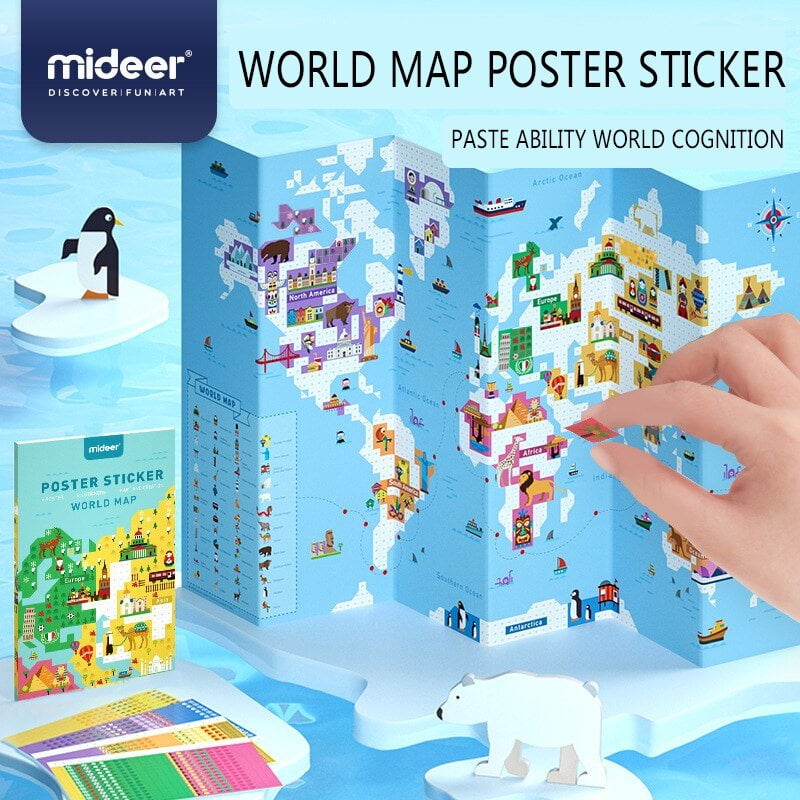 Aceasta harta este un instrument didactic si distractiv pentru cei mici. Acestia adora sa se joaca cu stickere, culori si cu jocuri cu numere. Jocul educativ este prezentat sub forma de Harta Lumii. Imaginile colorate, cu ilustratii dragalase ii vor face pe micutii exploratori sa isi doreasca sa descopere si sa absoarba cat mai curand informatii despre continente, tari si despre elementele reprezentative ale acestora.