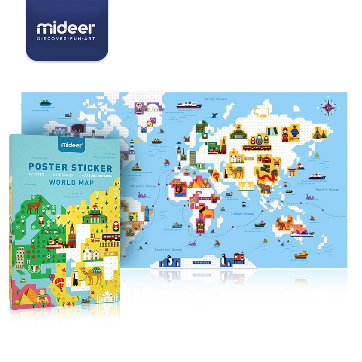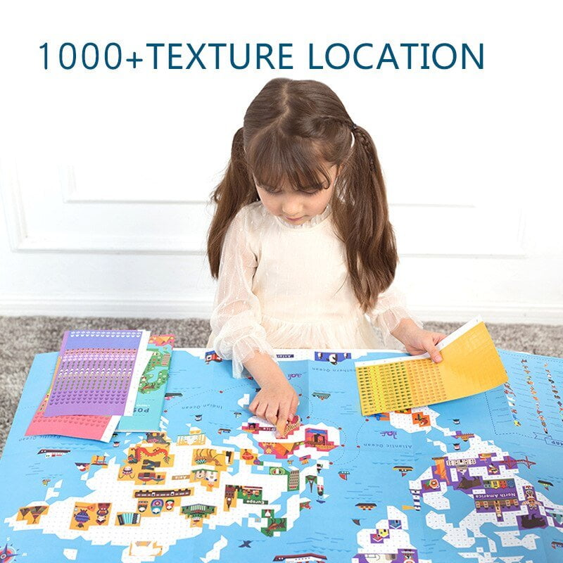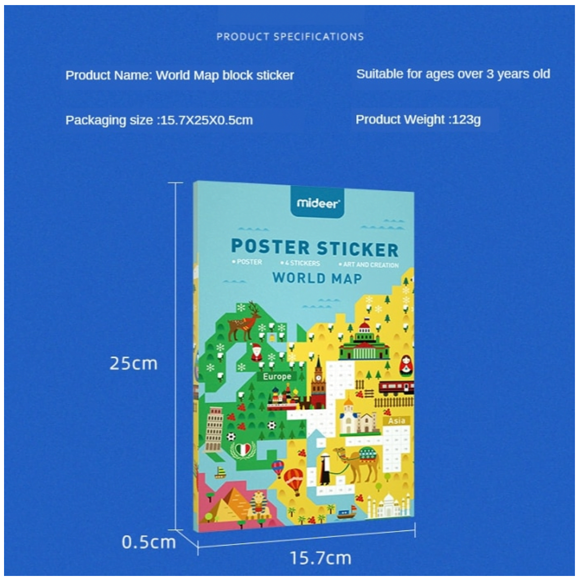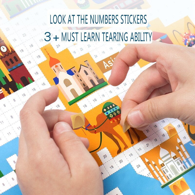 Fiecarui continent i-a fost atribuita o culoare separata, facand invatarea acestora mult mai usoara. Totodata, printre culorile vii gasim si patratele numerotate, pe care cei mici le vor folosi apoi pentru a lipi stickerele in locurile potrivite.