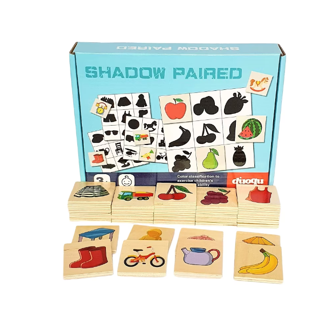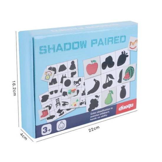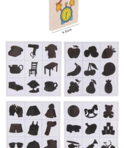 • Cutia din lemn include 36 de carduri din lemn cu imaginile reale si 4 piese mari cu cate 9 imagini in umbra.
