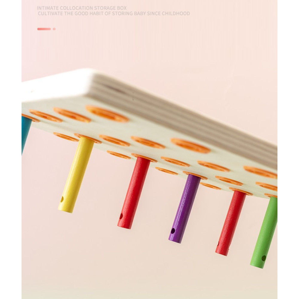 Jocul educativ de tip Montessori, Geobord, este o unealtă versatilă și creativă pentru dezvoltarea abilităților motrice fine, coordonării mână-ochi și învățarea secvențelor logice. Setul include o tablă din lemn prevăzută cu 25 de găuri și știfturi colorate din lemn, alături de șnururi colorate și carduri de activități cu modele de urmat.