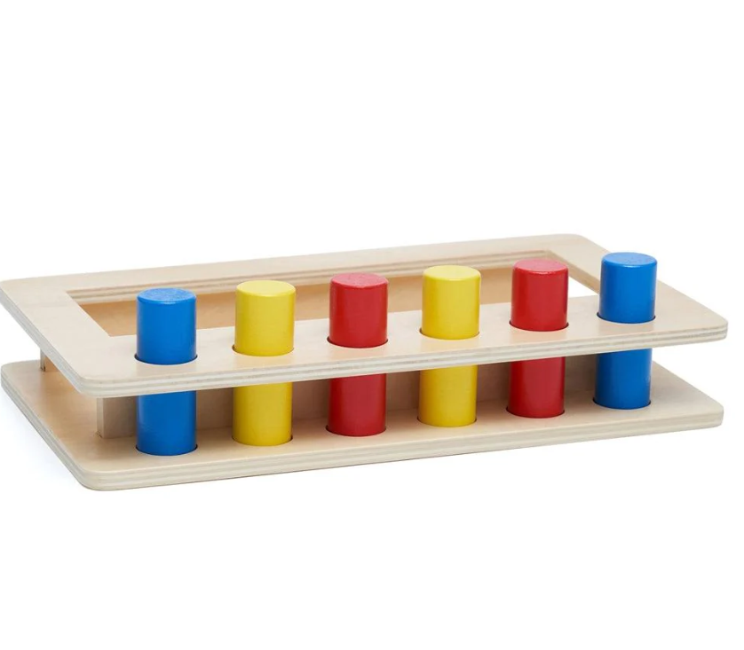- Împingerea pionilor: Copilul folosește mâinile pentru a împinge pioni colorați prin găurile de pe partea superioară a tăvii. Fiecare pion are o culoare distinctă și dimensiuni ușor de manevrat pentru micuți.