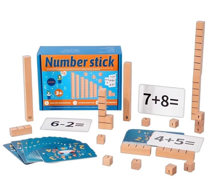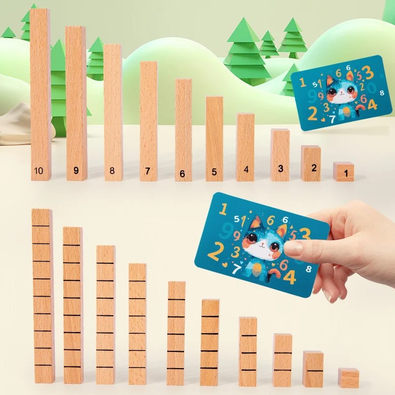 - 10 bețe numerice din lemn, gradate și numerotate de la 1 la 10, fiecare crescând în lungime proporțional cu numărul reprezentat.