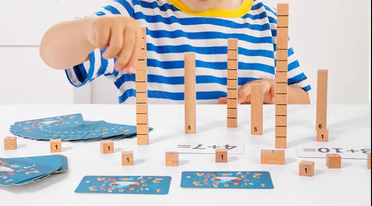 - Utilizează bețele și cuburile din lemn pentru a realiza calculele. De exemplu, pentru 4+3, selectează bețele cu numerele 4 și 3 și așază-le împreună pentru a forma rezultatul.