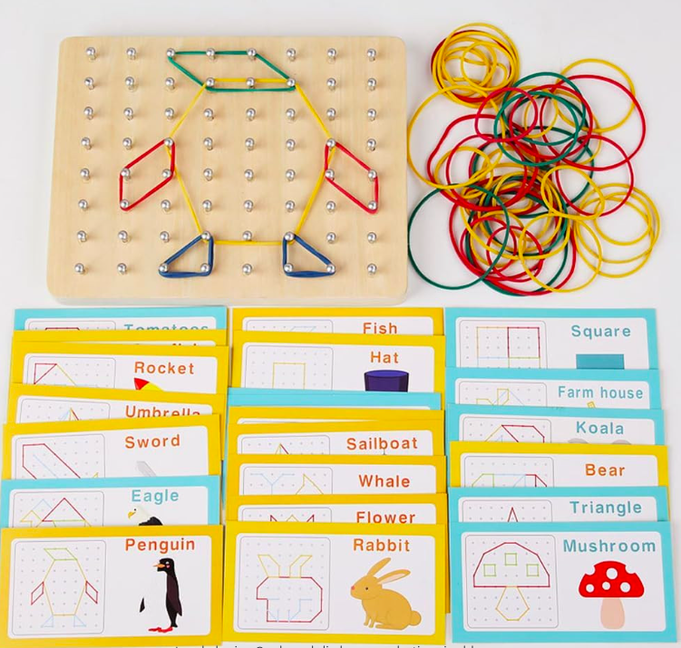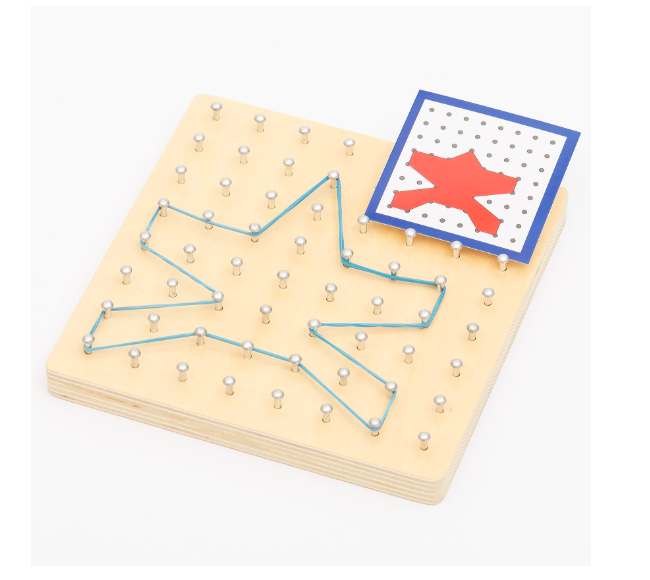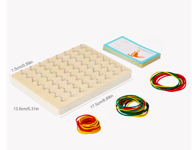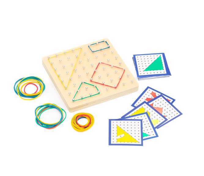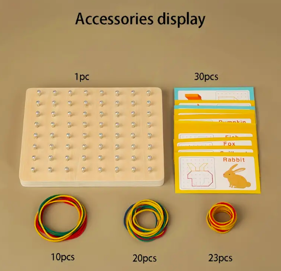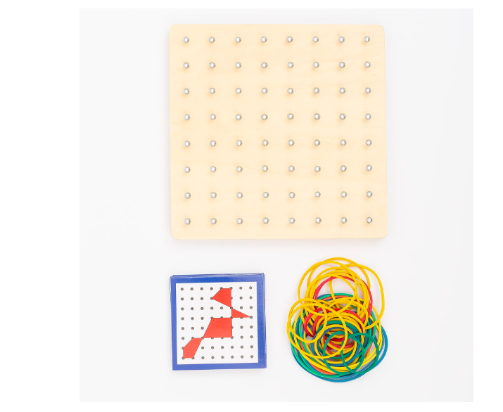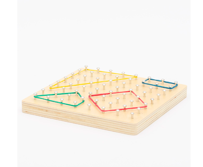 Jocul este format dintr-o placa din lemn, geoboard, de tip Montessori, care contine coloane.