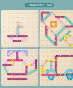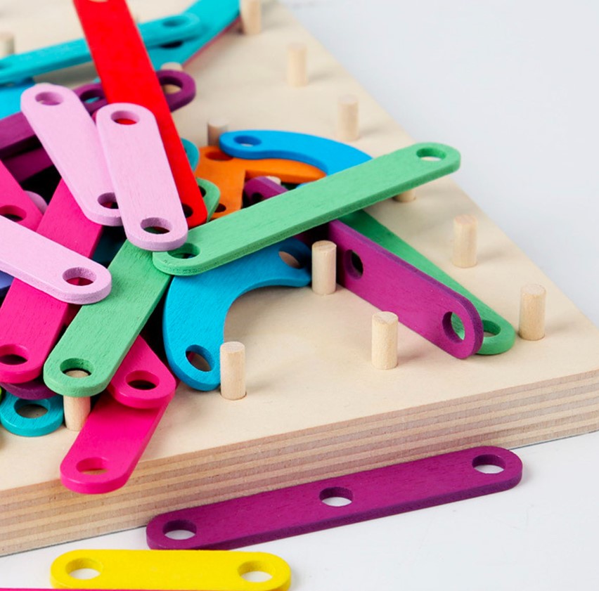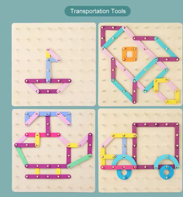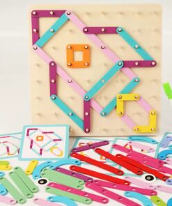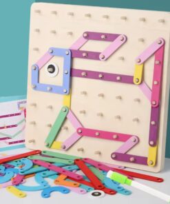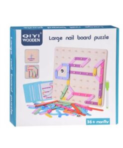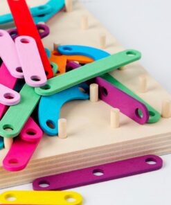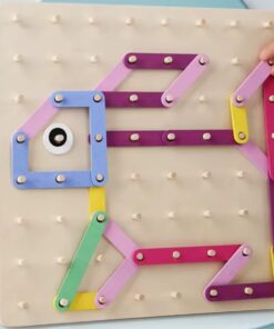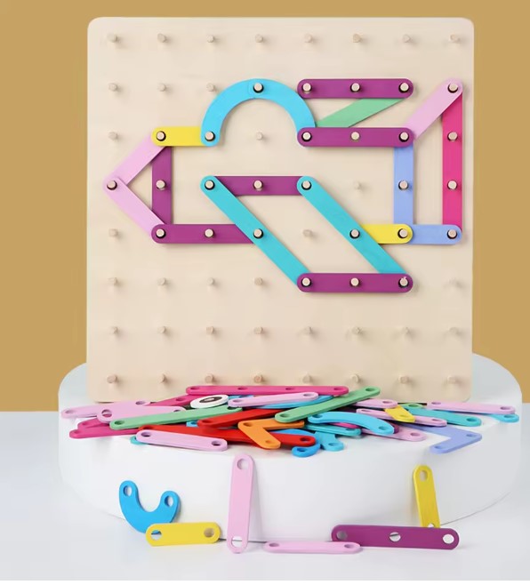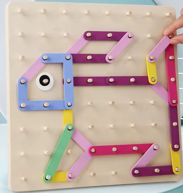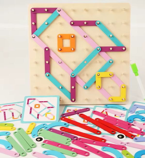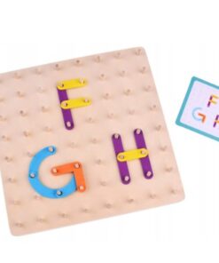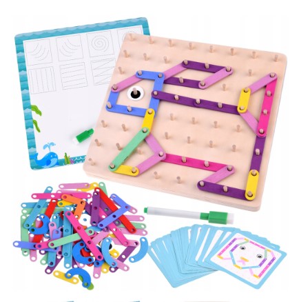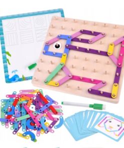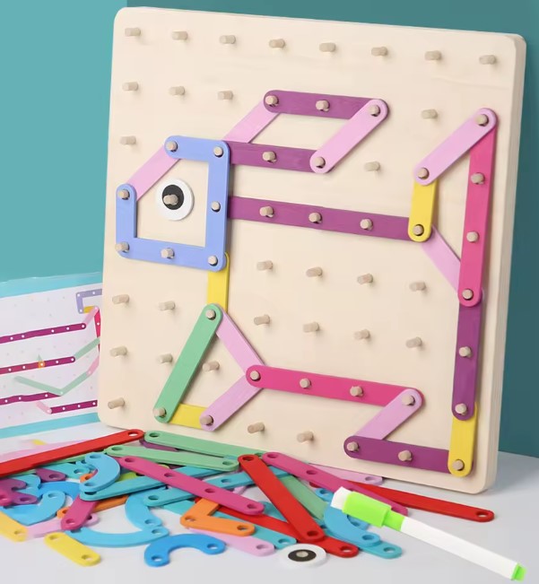 Geobordul Montessori este un joc educativ multifuncțional din lemn, conceput pentru a stimula gândirea creativă și dezvoltarea cognitivă a copiilor. Inspirat din pedagogia Montessori, acest joc îi încurajează pe cei mici să exploreze forme, litere, cifre și animale prin manipularea elementelor colorate și fixarea acestora pe o placă prevăzută cu pini din lemn.