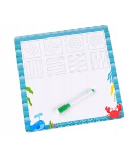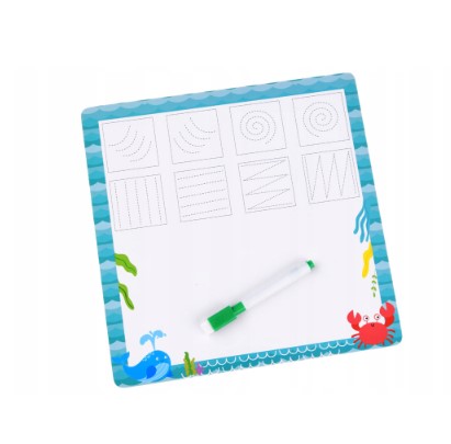 Pe spatele cardurilor poate exersa scrisul sau trasarea liniilor cu markerul inclus.