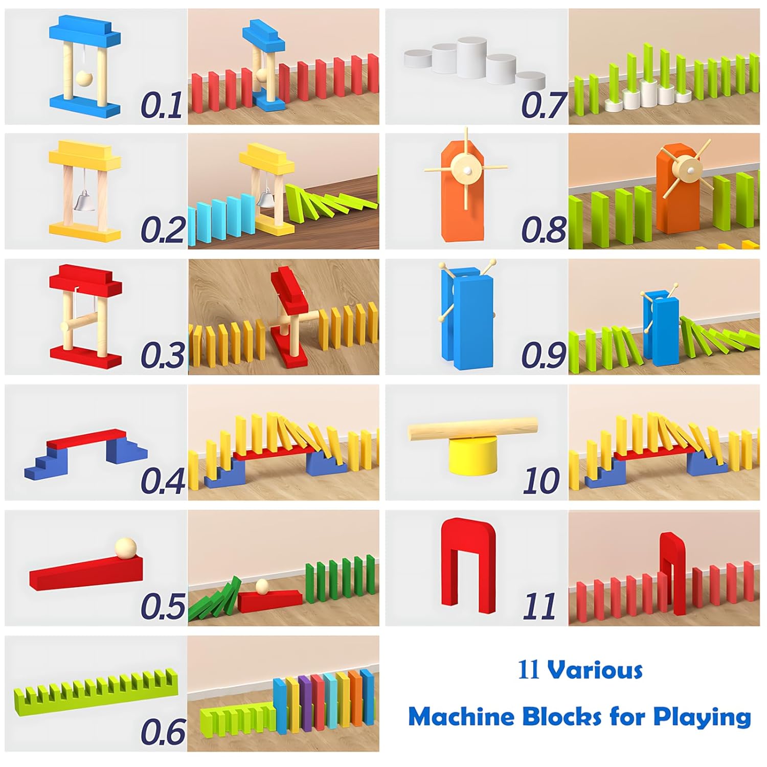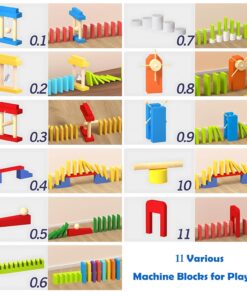Pe lângă clasicele linii de domino, copiii pot integra 11 blocuri speciale (clopoțel, poartă, pod, balansier, roată etc.), care fac ca fiecare construcție să fie diferită și captivantă.