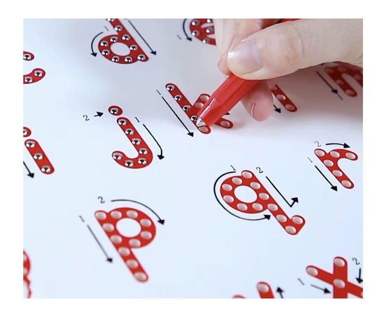 Copilul utilizează stiloul magnetic pentru a ridica biluțele în ordinea săgeților, urmărind traseul corect al fiecărei cifre.