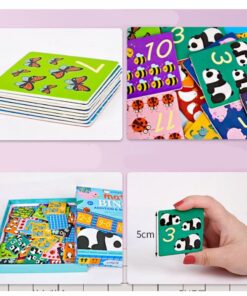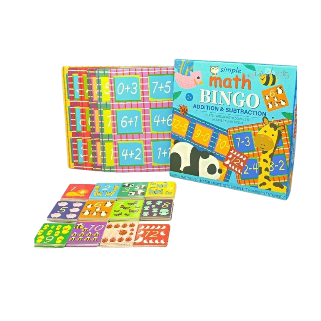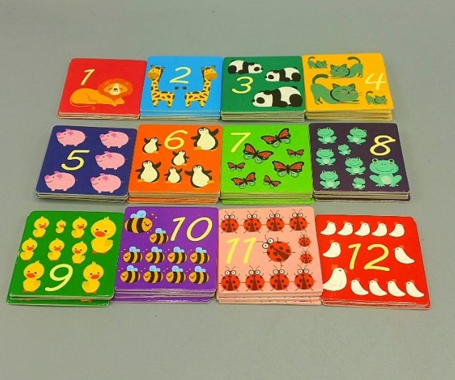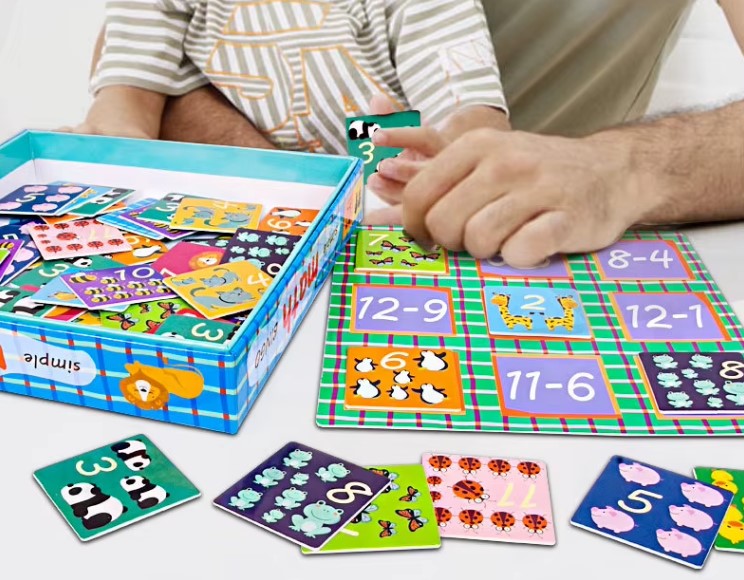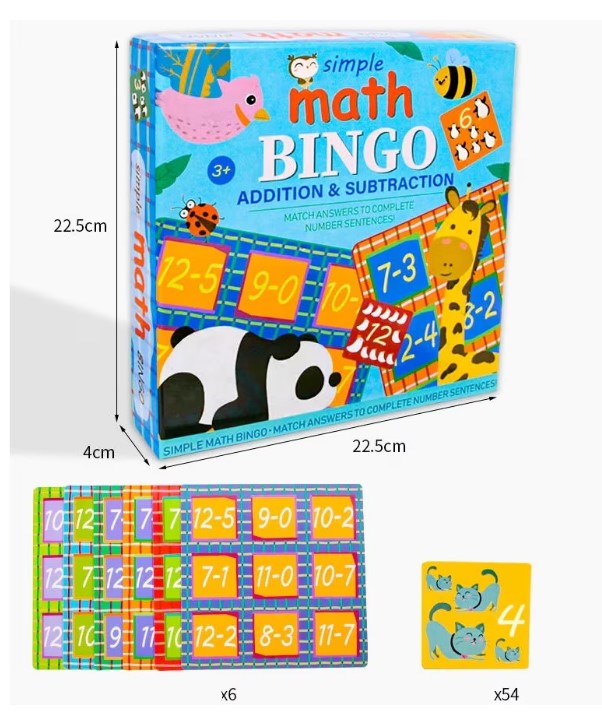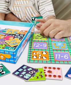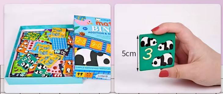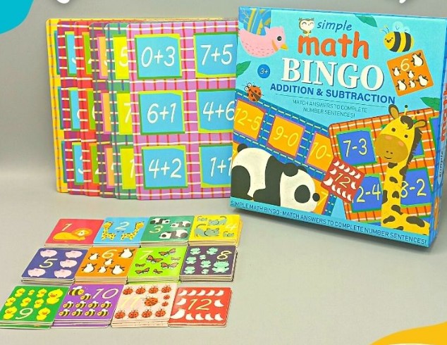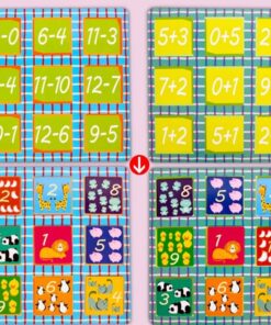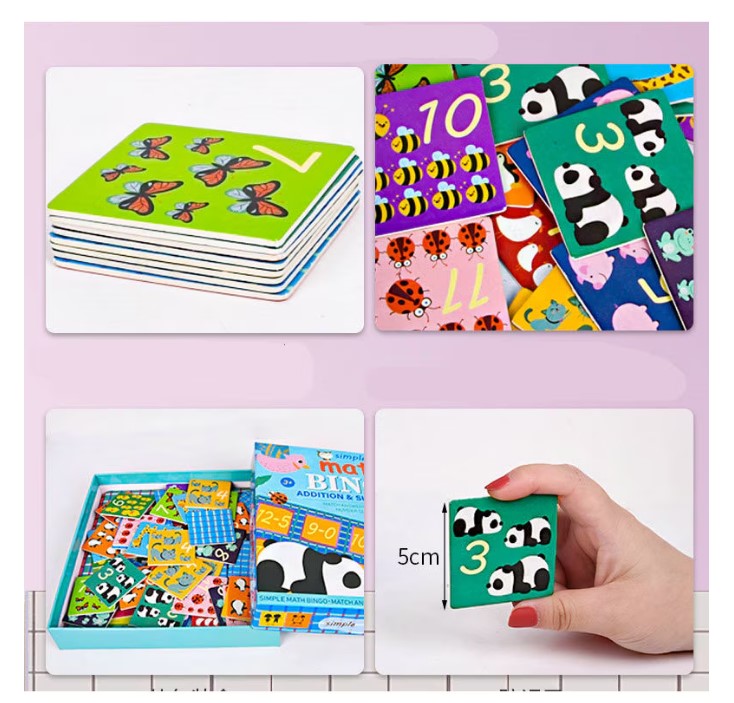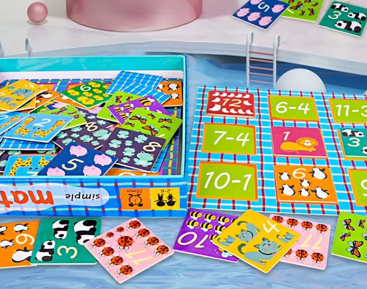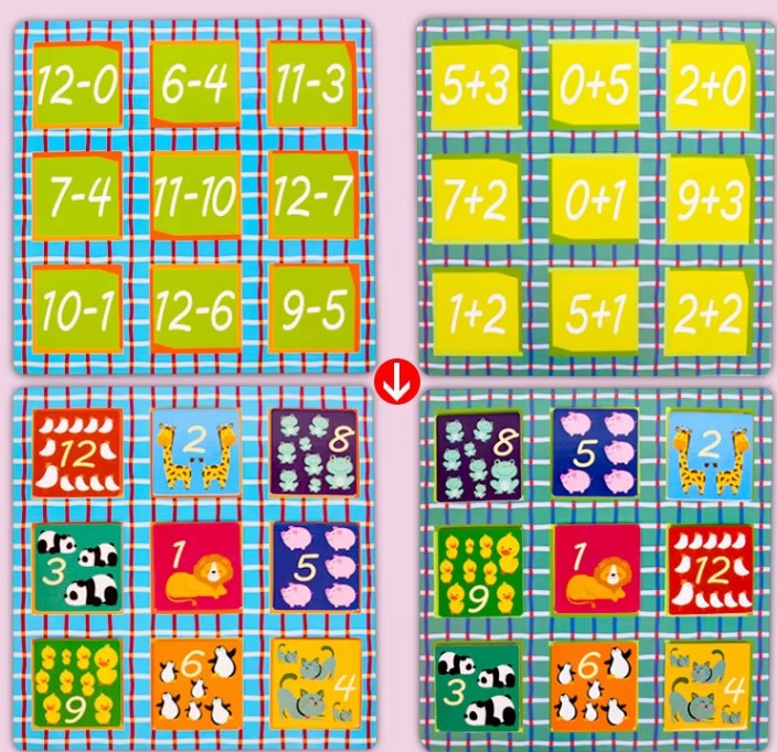 Fiecare cartonaș este inscripționat cu cifre sau imagini reprezentând cantități, iar planșele includ exerciții de adunare și scădere simple. Copiii trebuie să asocieze rezultatul corect cu exercițiul corespunzător, exersând astfel recunoașterea numerelor și înțelegerea relațiilor matematice.