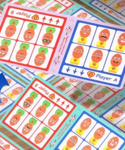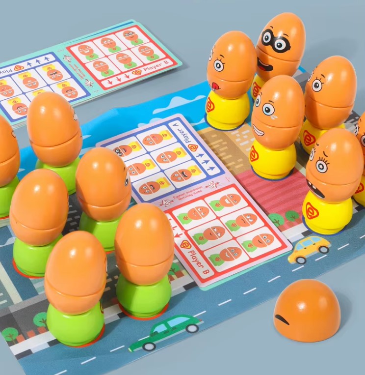 Setul include și cartonașe de joc cu modele de expresii, care ghidează copilul să potrivească ouăle, dar și o planșă colorată care transformă totul într-un joc de echipă sau competiție între doi jucători.