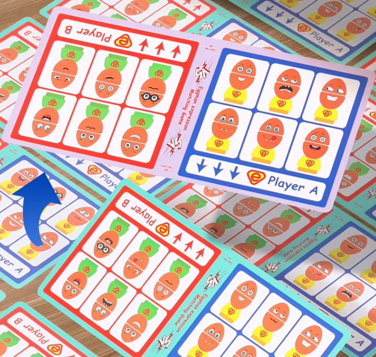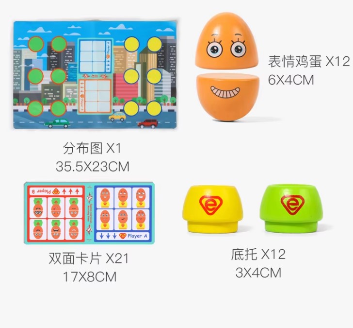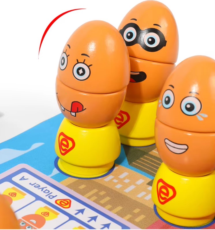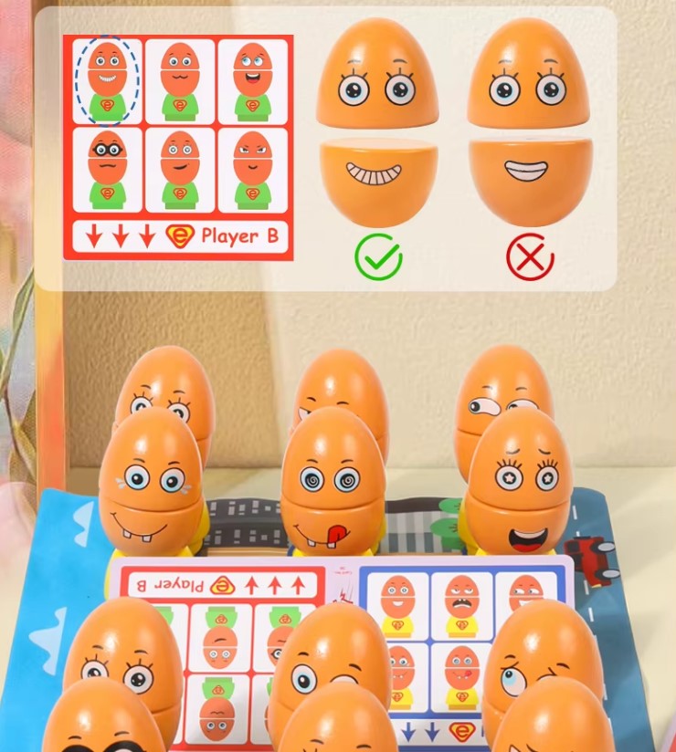 Copilul extrage un cartonaș și trebuie să combine ouăle astfel încât să reproducă expresia arătată pe model. Jocul poate fi folosit și liber, copilul inventând fețe amuzante sau povestioare cu ajutorul ouălor.