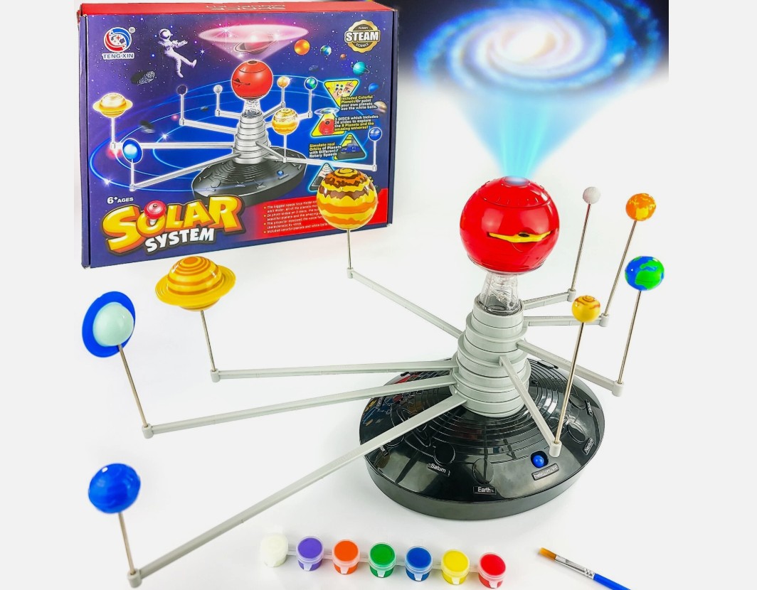 Joc educativ STEM – Proiector Sistemul Solar cu proiecție, sunete și pictură DIY. Copiii construiesc, colorează și învață despre planete într-un mod distractiv și interactiv. Ideal de la 6 ani+.
