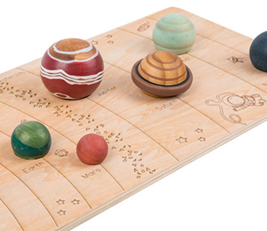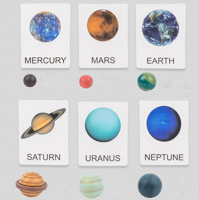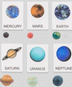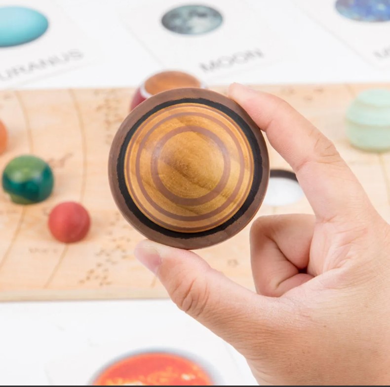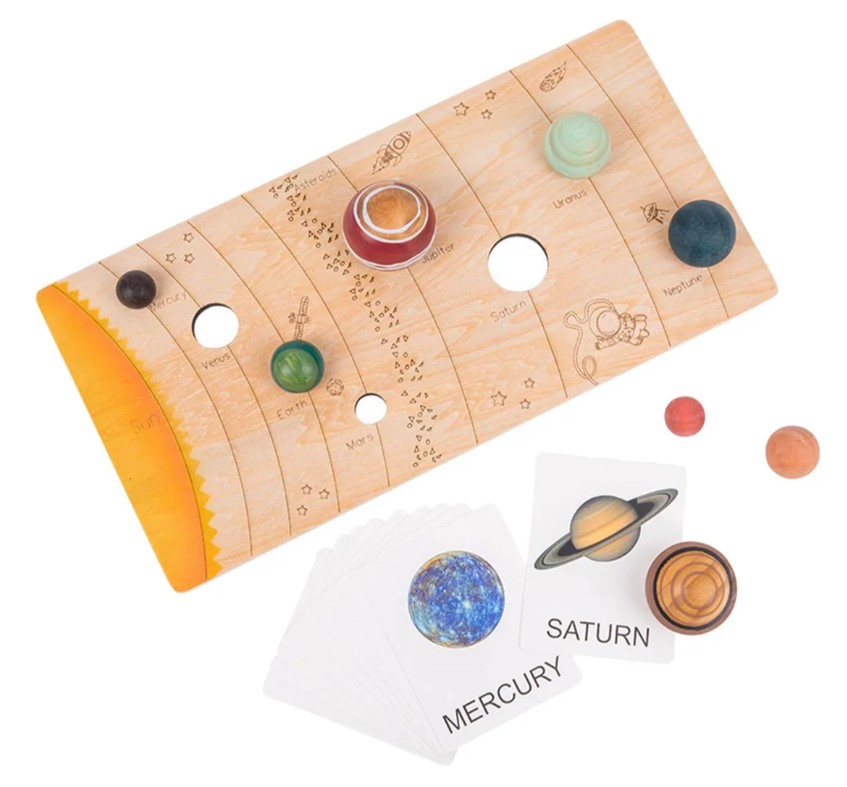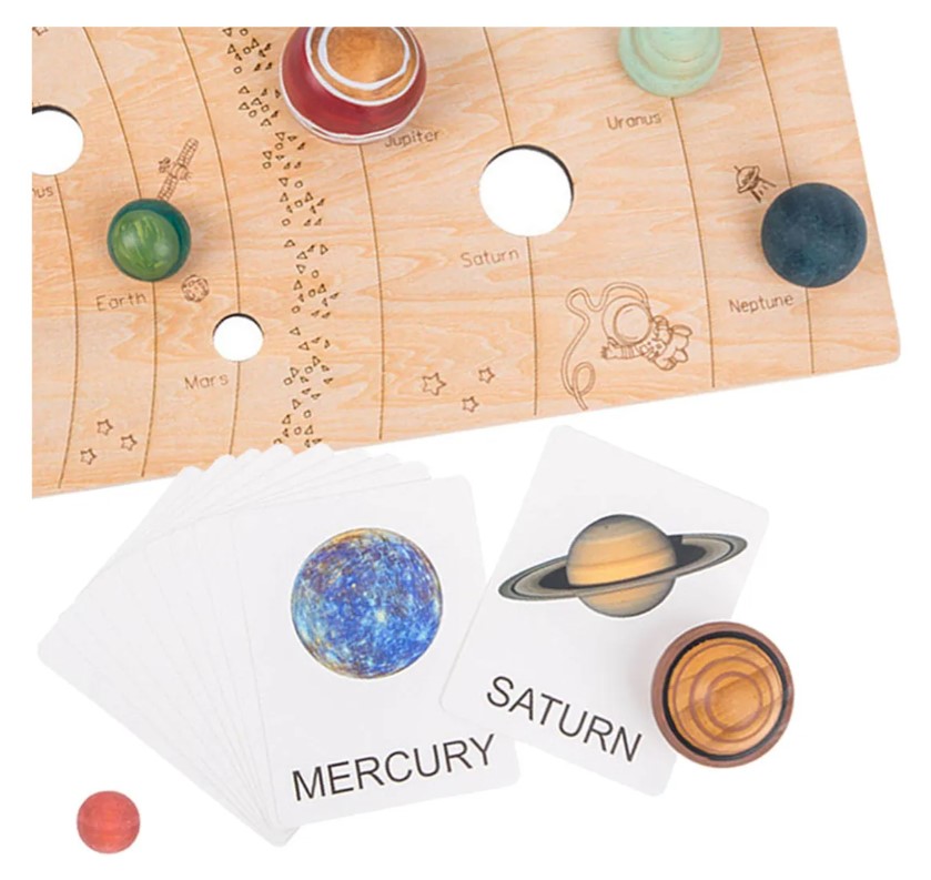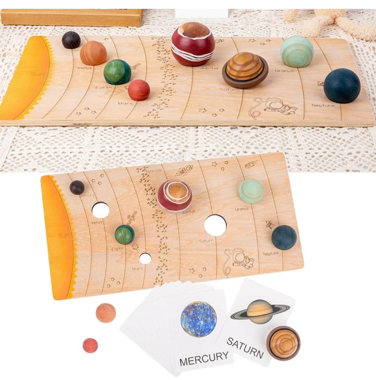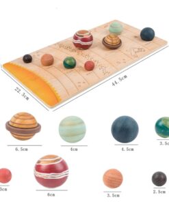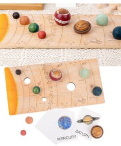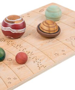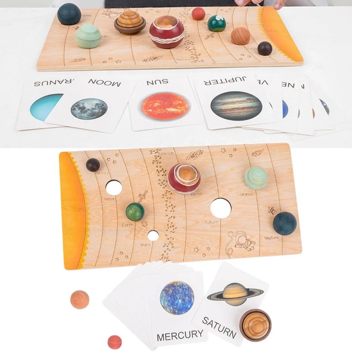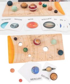 Conținut: suport din lemn gravat cu orbitele planetelor, 8 planete din lemn în relief (Mercur, Venus, Pământ, Marte, Jupiter, Saturn, Uranus, Neptun), cartonașe ilustrate cu imagini reale ale planetelor și denumirile acestora în limba engleză.