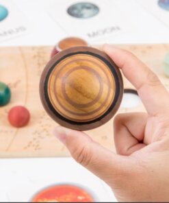 Asociere planetă – poziție: copilul potrivește fiecare planetă sferică în locașul său corespunzător de pe suportul din lemn, exersând recunoașterea formelor, potrivirea spațială și denumirile planetelor.