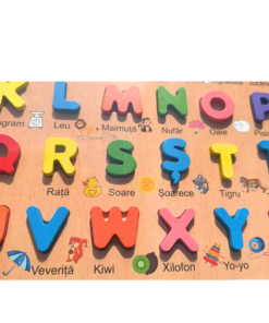 Jocul educativ Alfabet românesc este un puzzle încastru colorat și interactiv, conceput pentru a-i ajuta pe copii să învețe literele alfabetului într-un mod distractiv și intuitiv. Fiecare literă este realizată din lemn gros, ușor de manevrat de către cei mici, și este însoțită de o imagine sugestivă și un cuvânt care începe cu acea literă, scris în limba română.