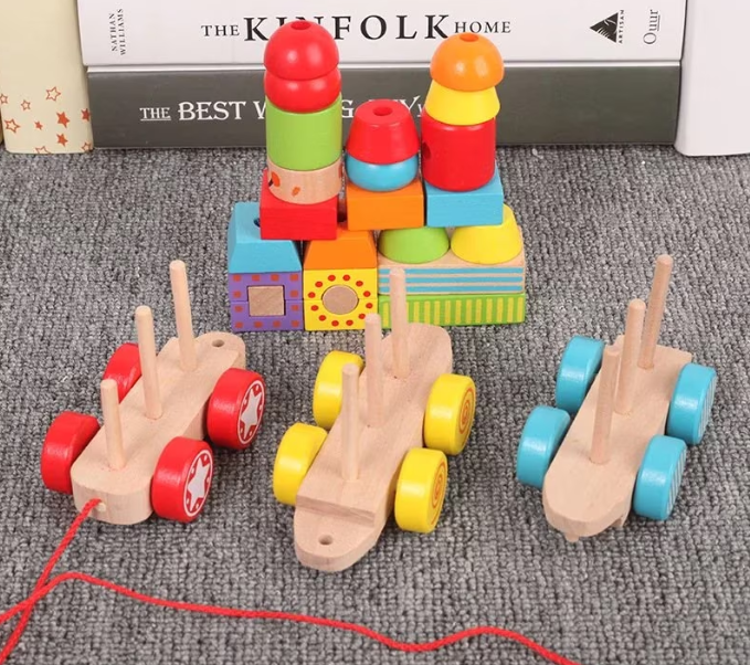 - Dezvoltarea coordonării mână-ochi: Copiii își exersează abilitățile motorii fine prin manipularea și stivuirea blocurilor de lemn pe vagoane.