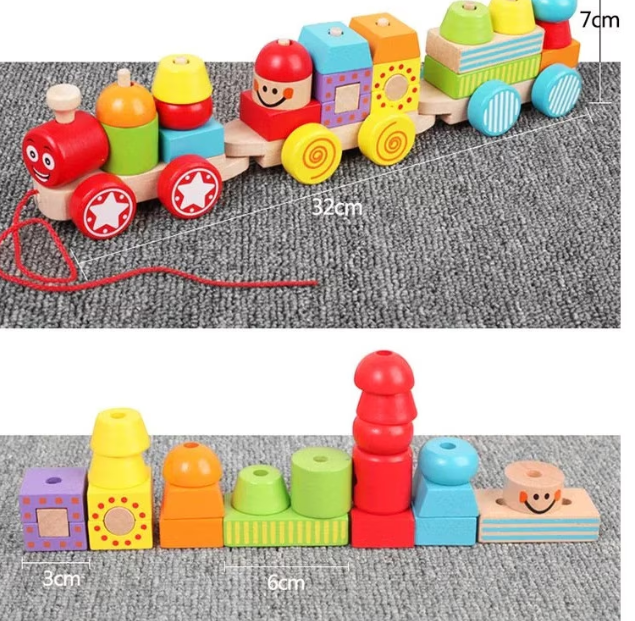 - Componente: Trenulețul este alcătuit din mai multe blocuri colorate care pot fi stivuite în diferite combinații, fiecare vagon fiind detașabil și conectat prin cuie din lemn.