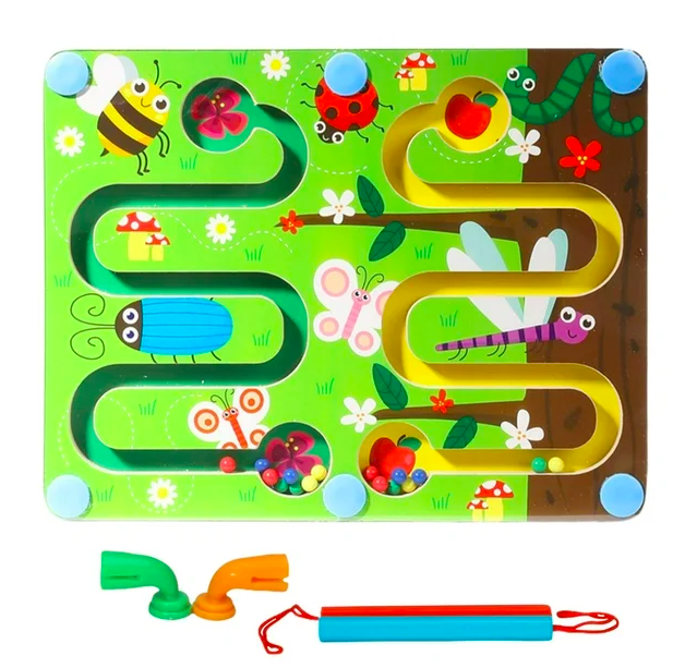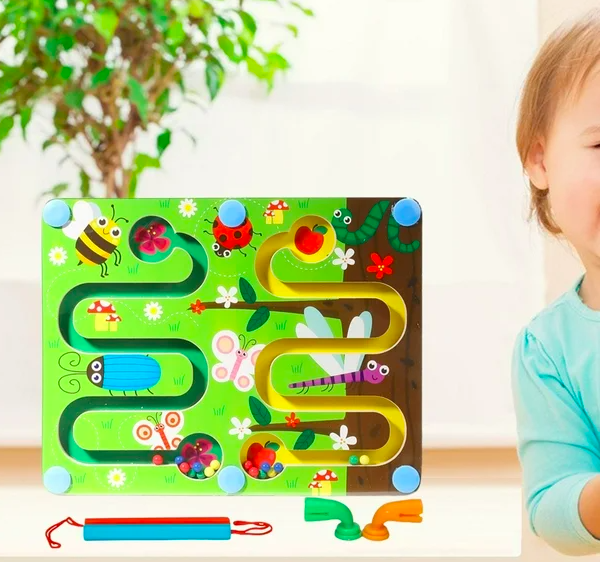 - Labirint magnetic: Copiii folosesc bagheta magnetică pentru a ghida bilele prin traseele sinuoase, învățând să-și coordoneze mișcările.