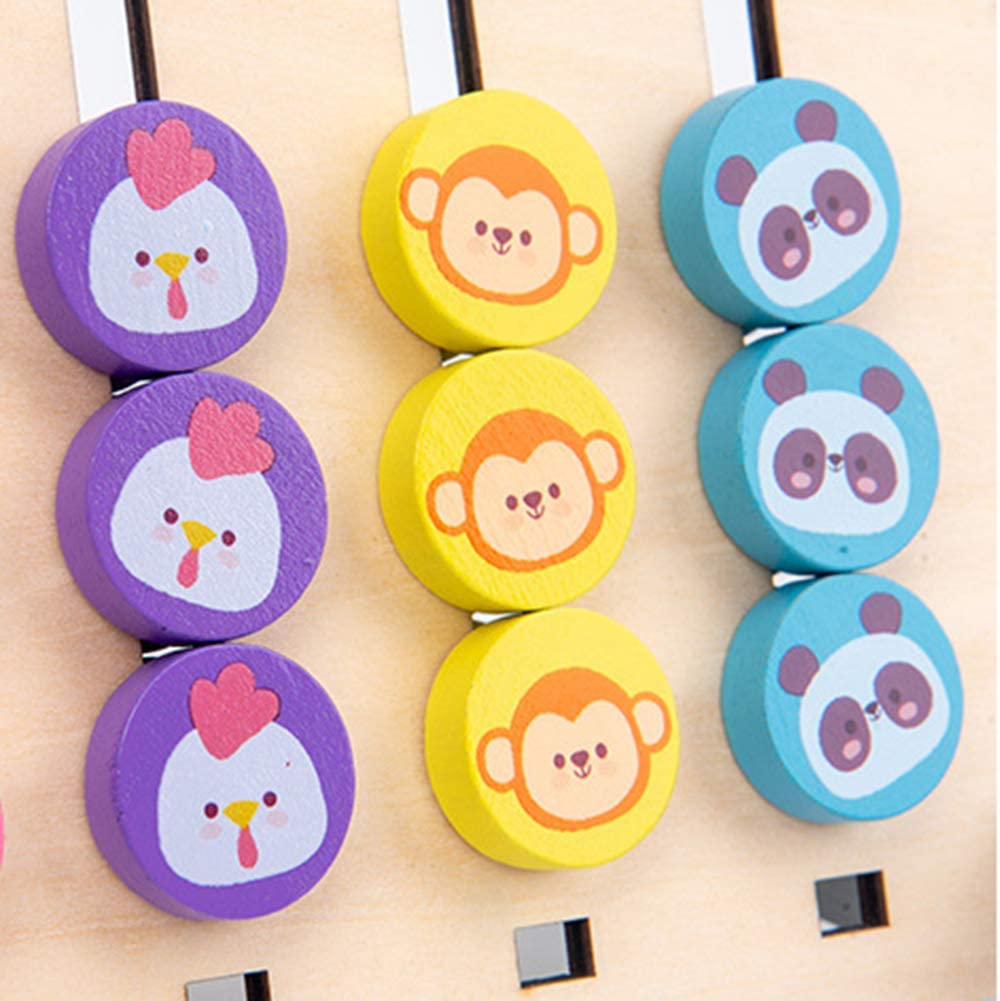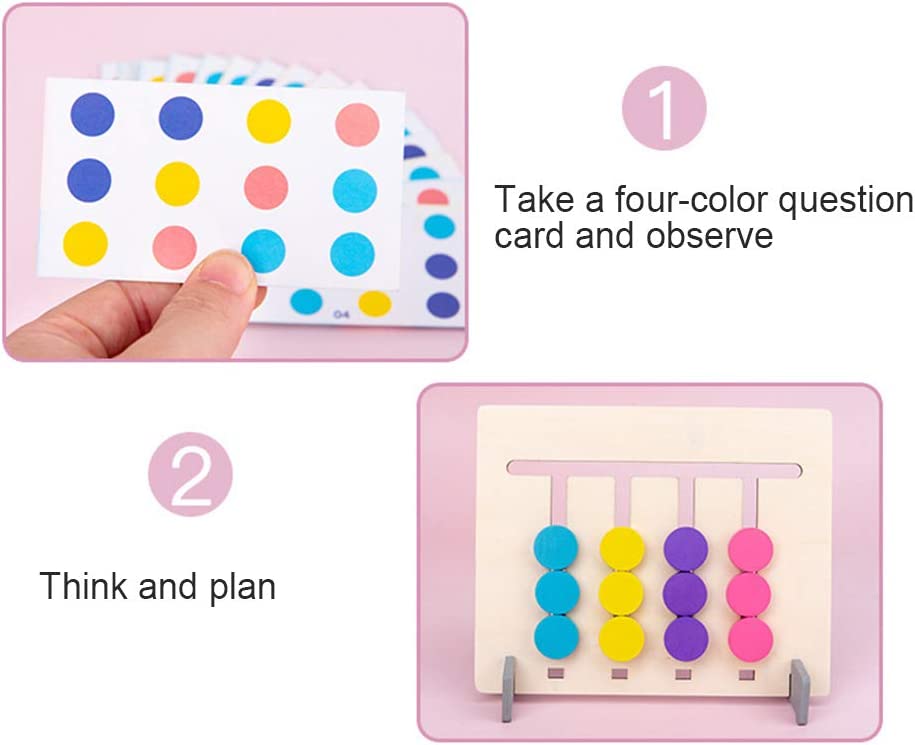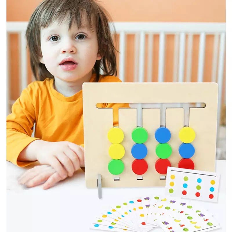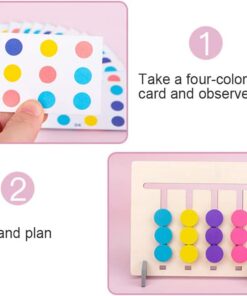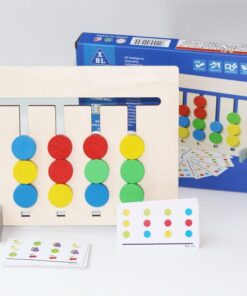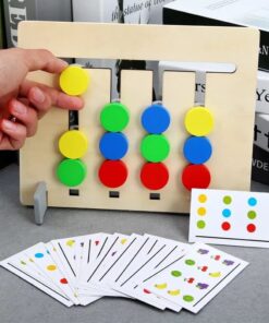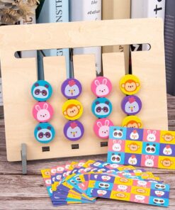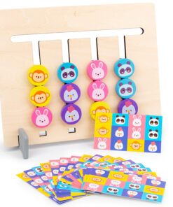 Include mini carduri cu diferite combinatii de culori si animale, de pe care copii trebuie sa urmareasca tiparul si sa mute piesele mobile pe canalele labirintului in asa fel incat dispunerea realizata sa corespunda cu modelul de pe card.