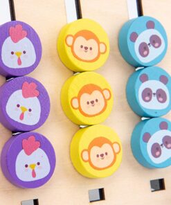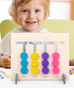 Un joc educativ de asociere si logica format dintr-un suport din lemn cu labirint cu 4 canale pe care se afla piese mobile rotunde ce reprezinta culori: 4 culori si 4 animale dispuse in suport.