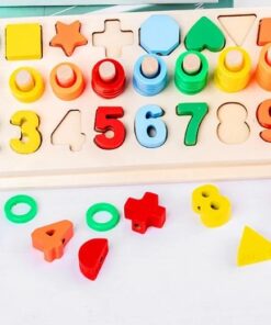 Un joc educativ complet și versatil, creat special pentru copiii de la 3 ani în sus, care combină învățarea numerelor, formelor și a logicii matematice cu activități motrice distractive. Realizat din lemn de calitate, cu margini rotunjite și vopsele non-toxice, jocul îmbină cinci activități într-un singur suport compact și colorat.
