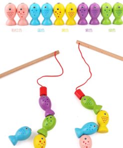 Acest joc de pescuit magnetic din lemn, cu design haios în formă de ursuleț, este o jucărie educativă ideală pentru copiii mici. Setul include peștișori colorați cu inserții magnetice și două undițe din lemn, transformând pescuitul într-o activitate distractivă și interactivă.
