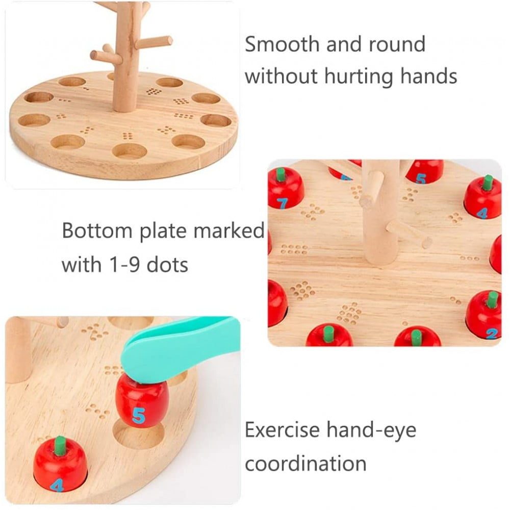 Cu ajutorul acestui joc educativ de tip Montessori, cei mici isi vor antrena dexteritatea, indemanarea, manevrand merele pe ramurile copacelului.