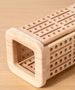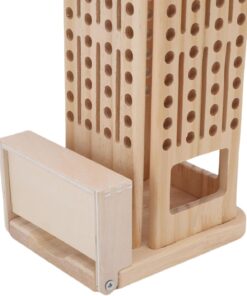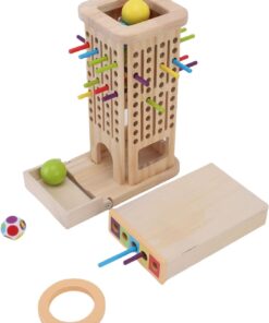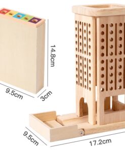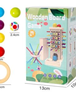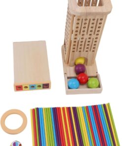Setul este realizat integral din lemn natural cu margini rotunjite, vopsit cu culori non-toxice, sigure pentru copii. Conține o structură verticală perforată, bețe colorate, bile din lemn, un cub de joc și accesorii pentru diferite moduri de joc. Copiii trebuie să introducă sau să extragă bețele fără ca bilele să cadă, exersând răbdarea și precizia mișcărilor.
